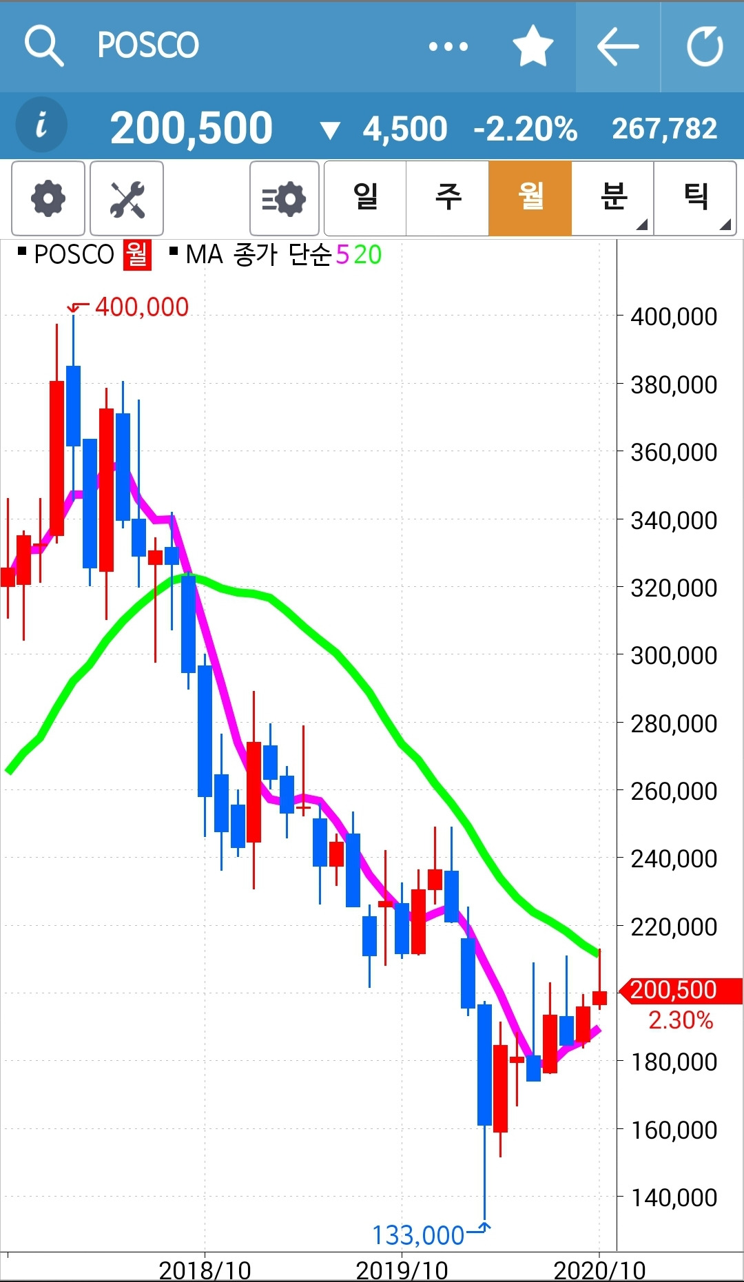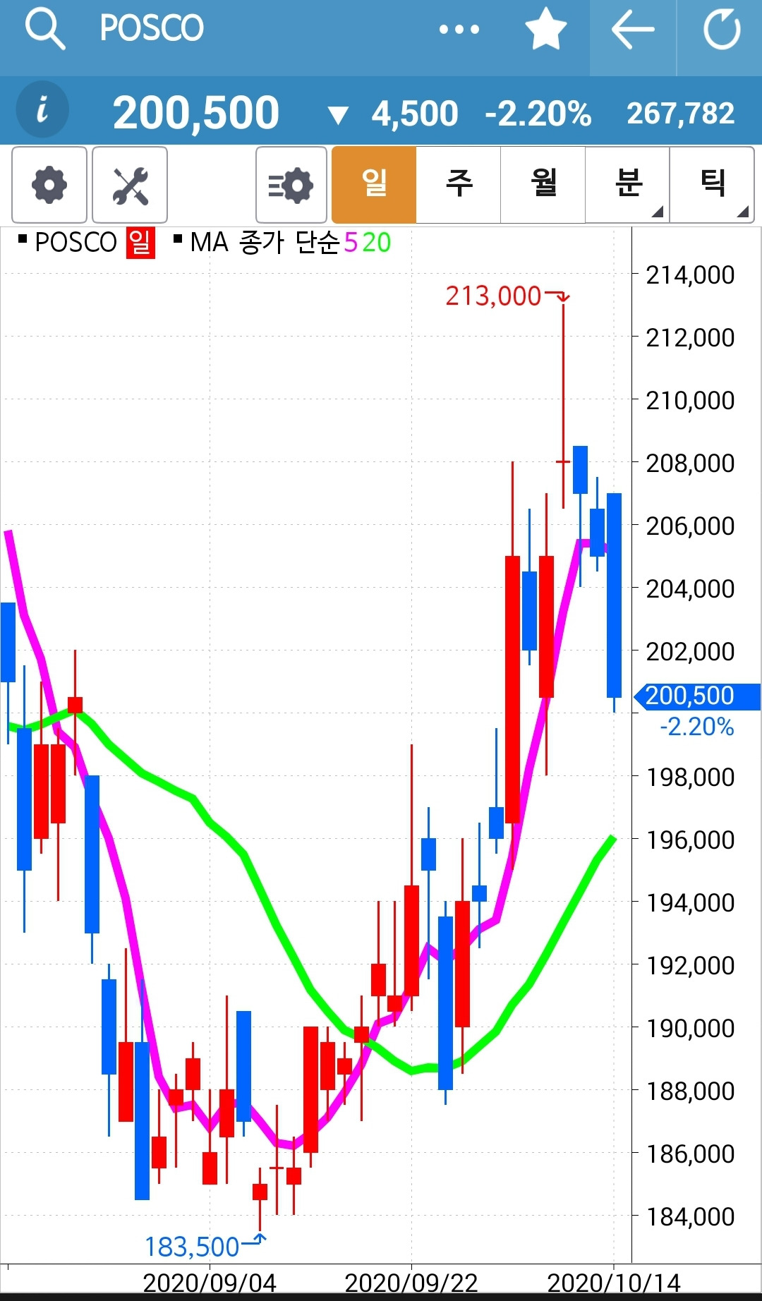 POSCO. 긴 음봉이 나왔다. 그래도 난 눈 하나 깜짝 안 한다. 와이? 5일선이 20일선 위에 있으니까. 그럴 땐 그냥 매수 유지니까. 난 아무것도 몰라요~ 니까. 하하 그저 파이팅을 외칠뿐.