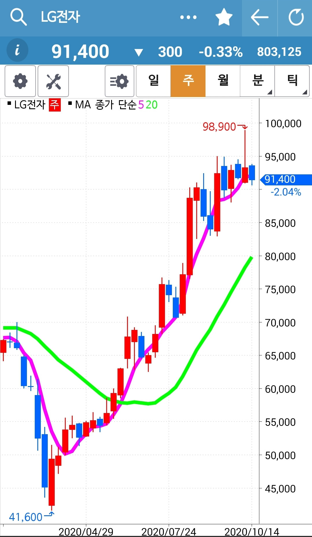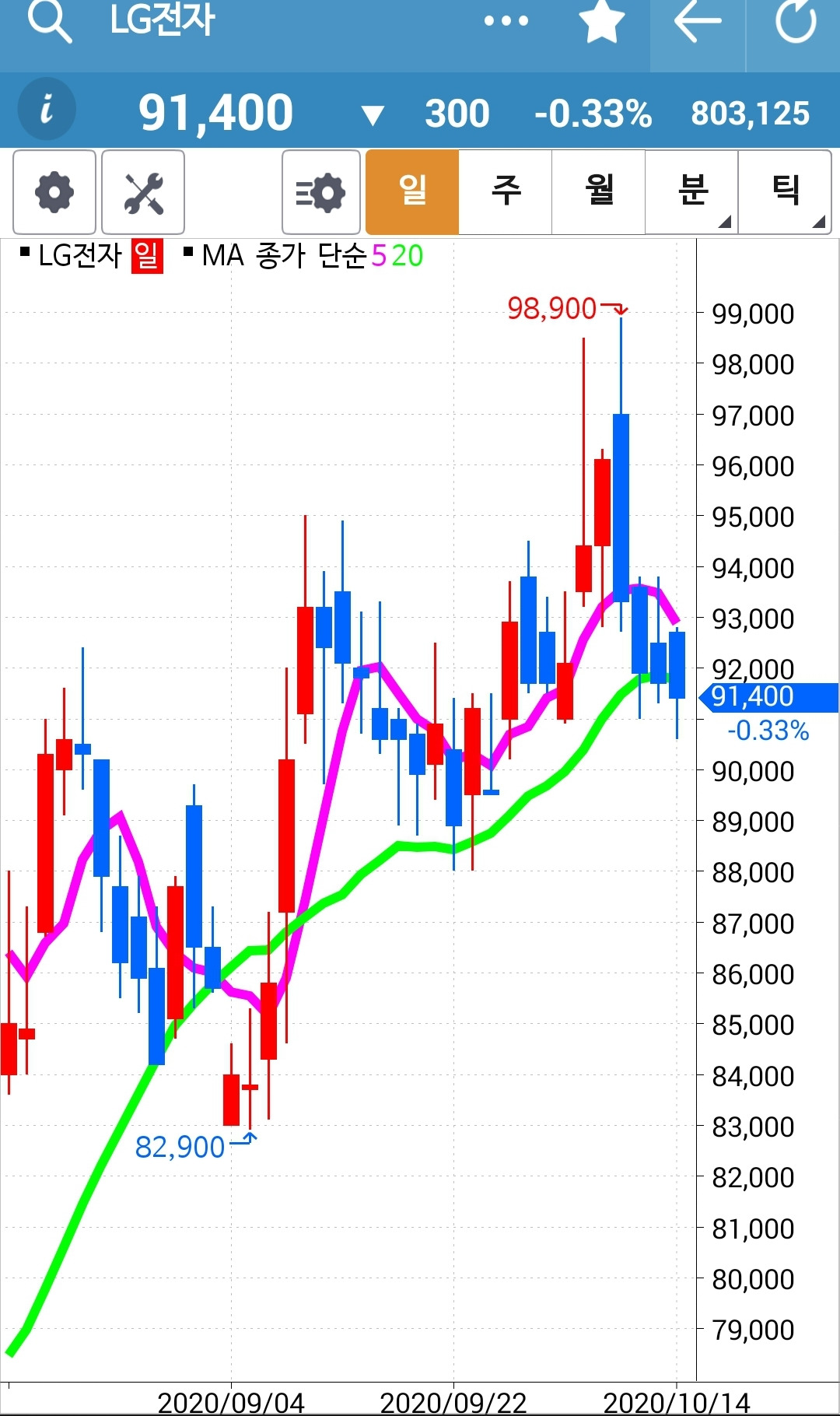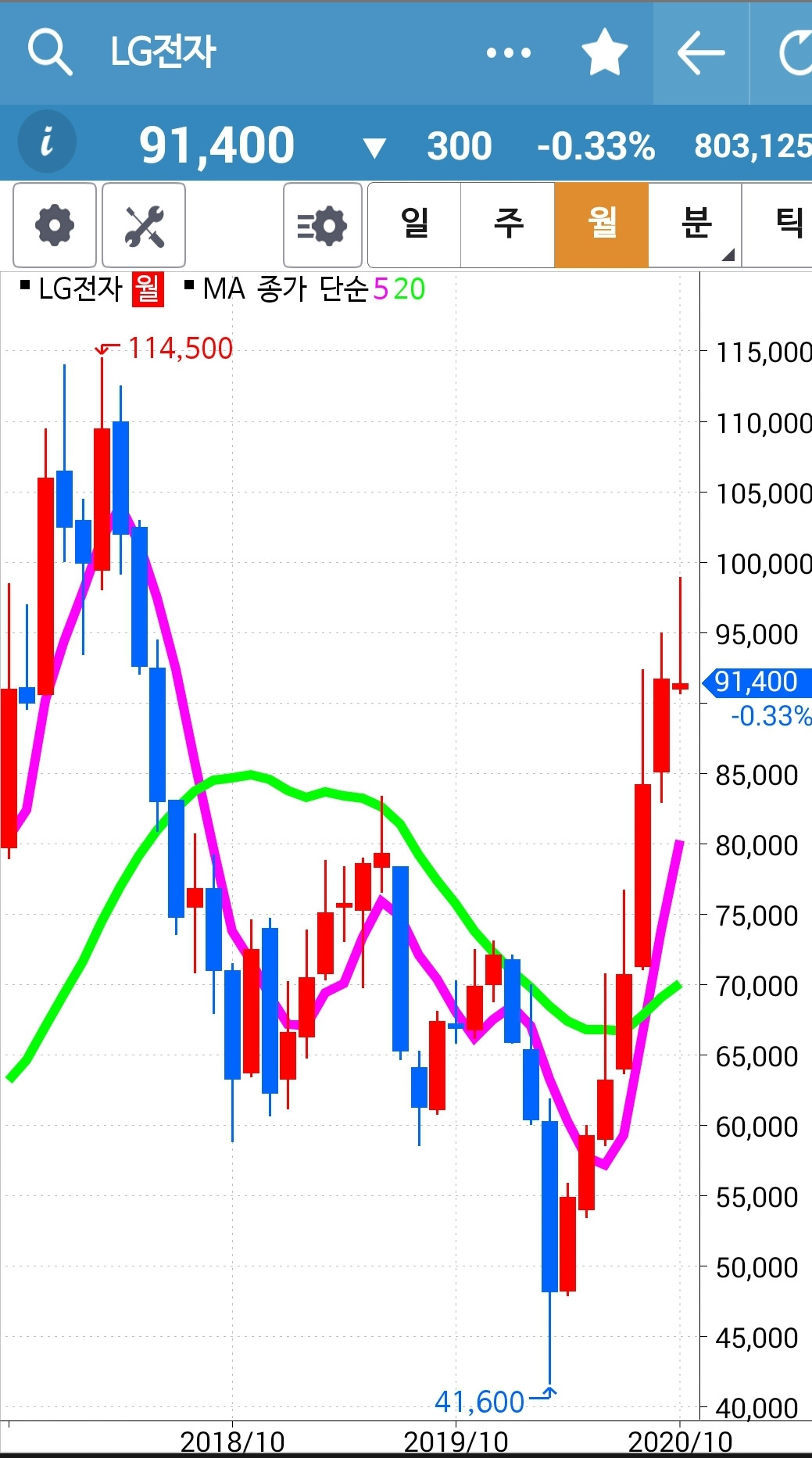 LG전자. 조만간 내려오겠다. 어떡하나. 또 20일선 아래를 휙 훑고 가면 어쩌나. 어쩌긴 무얼 어째. 5일선이 20일선 아래로 내려가는 순간 매도하는 거지. 난 아무것도 몰라요~ 5일선이 내려가면 매도해요~ 그래. 그때 난 자동 빵으로 할 수 있어. 다시 올라갈 거야 하면서 매도를 안 하는 우를 범하지는 않을 거야. 다시 올라가면 그때 다시 따라갈 거야. 손실이 크더라도. 그래. 난 그거만 하면 돼. 금년 과제니까.