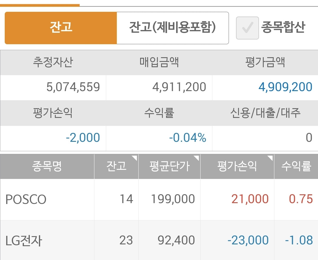사진 1. 현물 주식. 꼴랑 7만 원 수익이다. 게다가 나의 사랑 LG전자는 무려 마이너스로 돌아섰다. 에구.