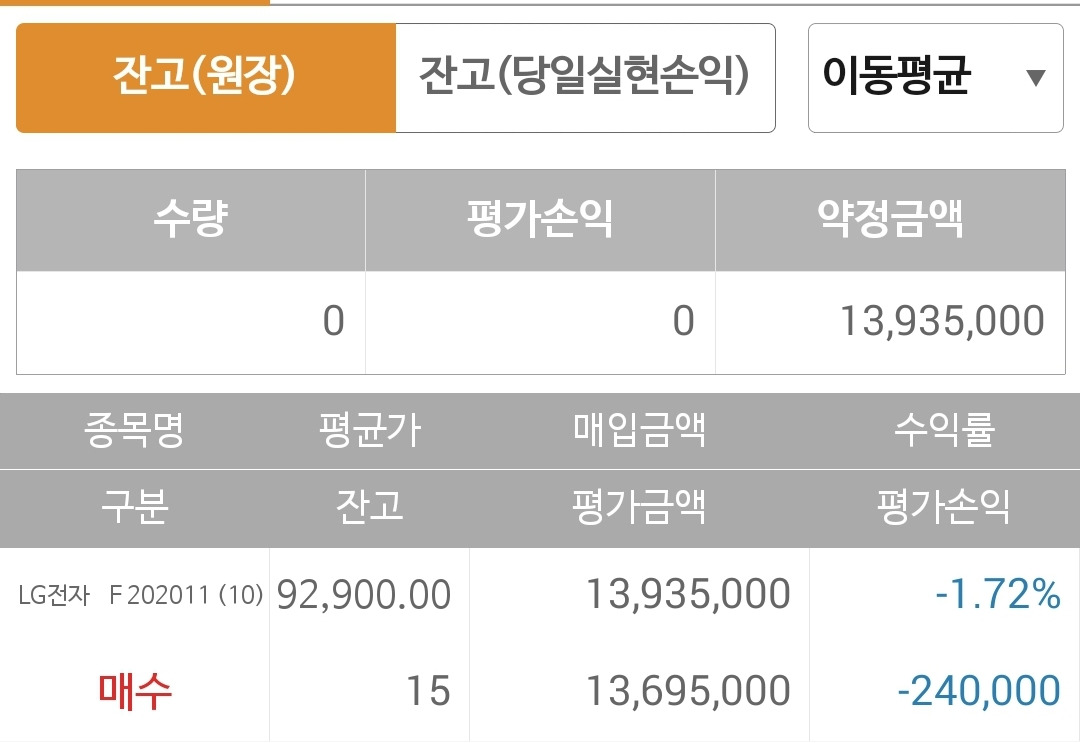 사진 2. 선물주식. 몽땅 LG전자에 쏟아붓더니. 하이고. 손실이 크다.