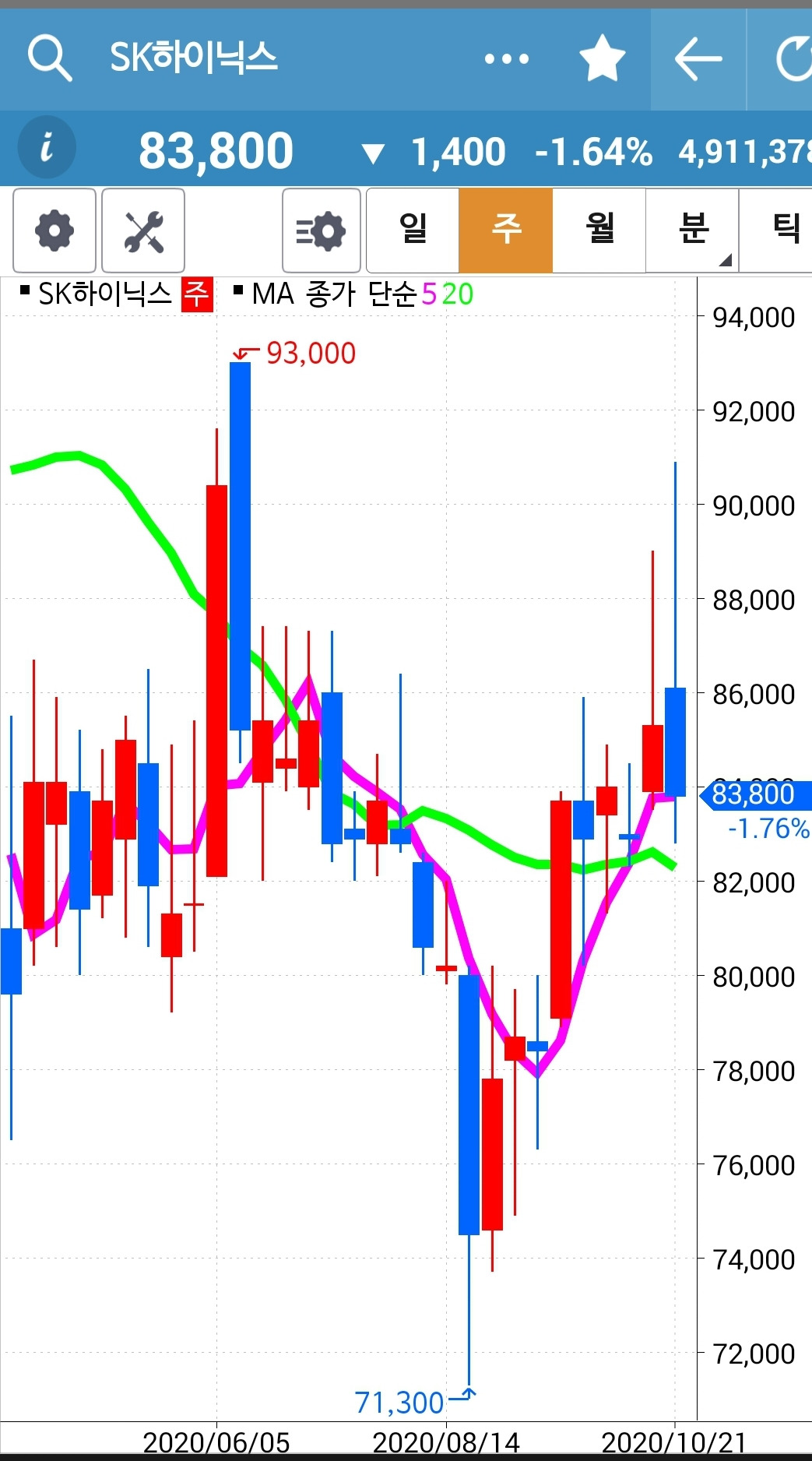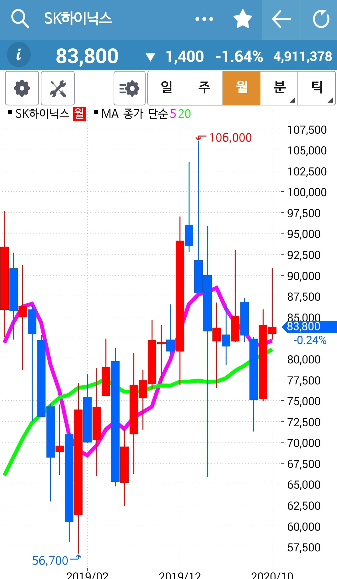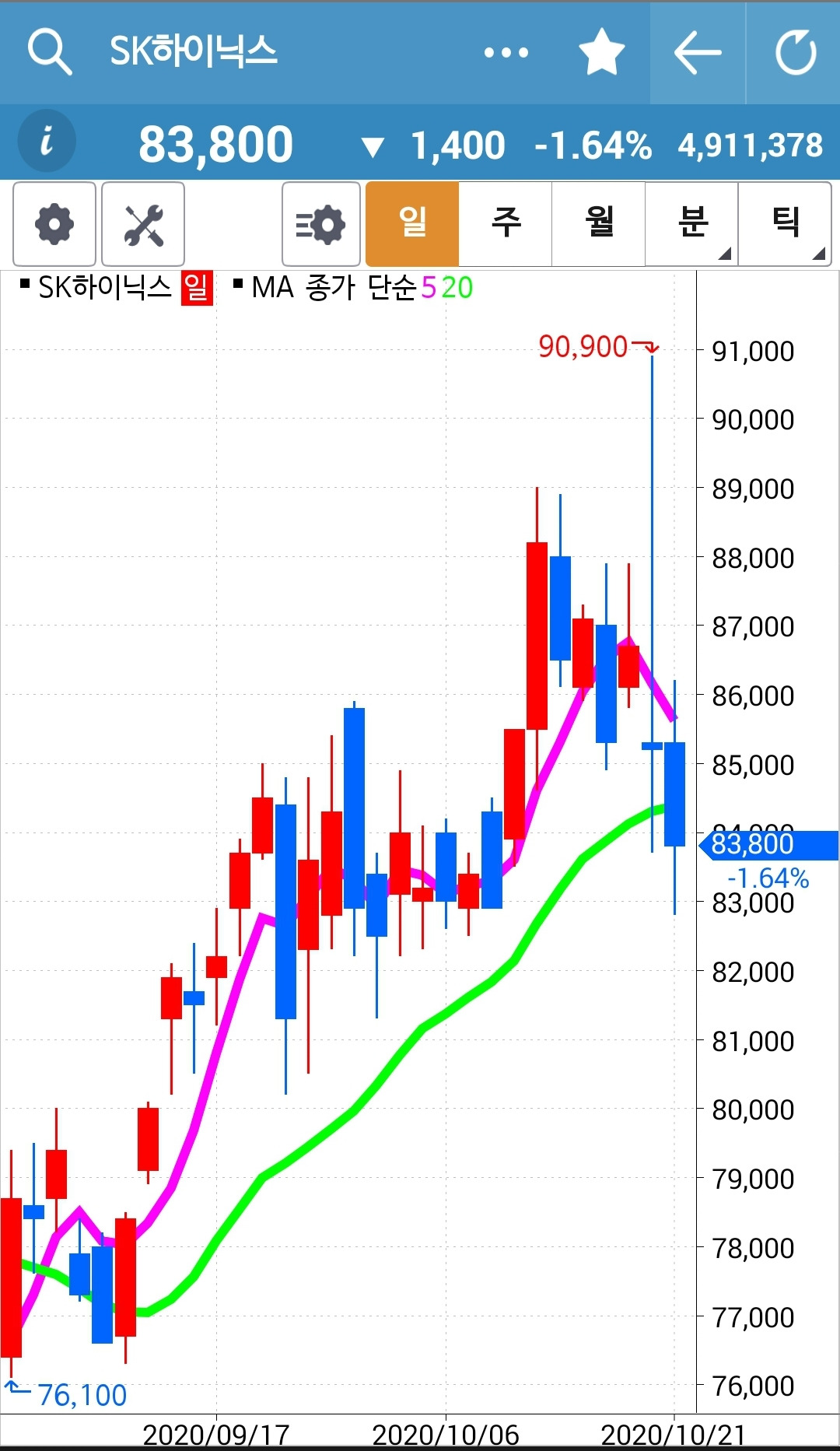 SK하이닉스. 이건 정말 어떻게 되려는 걸까. 모르겠다. 노려보다가 5일선이 20일선 뚫고 내려가는 순간 매도하리라. 종가를 기다려서 해야 할까? 보는 즉시 행동할까? 하. 요것도 어떤 땐 보는 즉시 실행이 좋고 어떤 땐 종가 실행이 좋으니 원칙을 정해야 하는데 아 모르겠다. 그것만은 대 원칙은 아니므로 실시간 느끼는 대로 하기로 한다. 융통성이다. 푸하하하 5일선이 20일선과 꽝! 부딪는 순간 매매가 일어나는데 그걸 종가에 하느냐 장중에 하느냐는 내 맘이라는 뜻이다. 즉 조금 풀어주겠다는 말. 어느 순간에 해도 그만이다. 5일선이 20일선 위에 있으면 매수! 아래 있으면 매도!라는 대원칙만 지켜지면 된다. 파이팅!