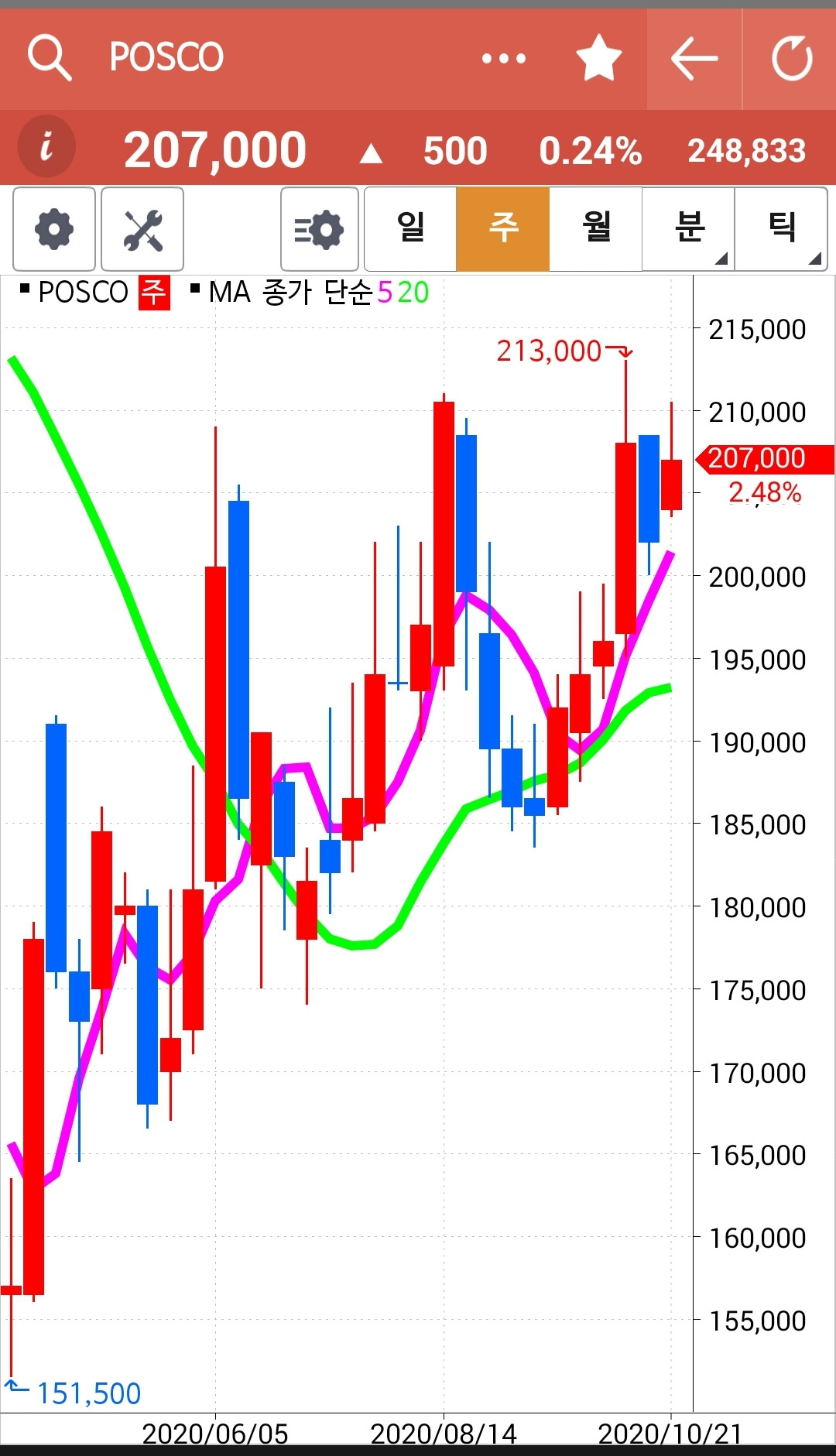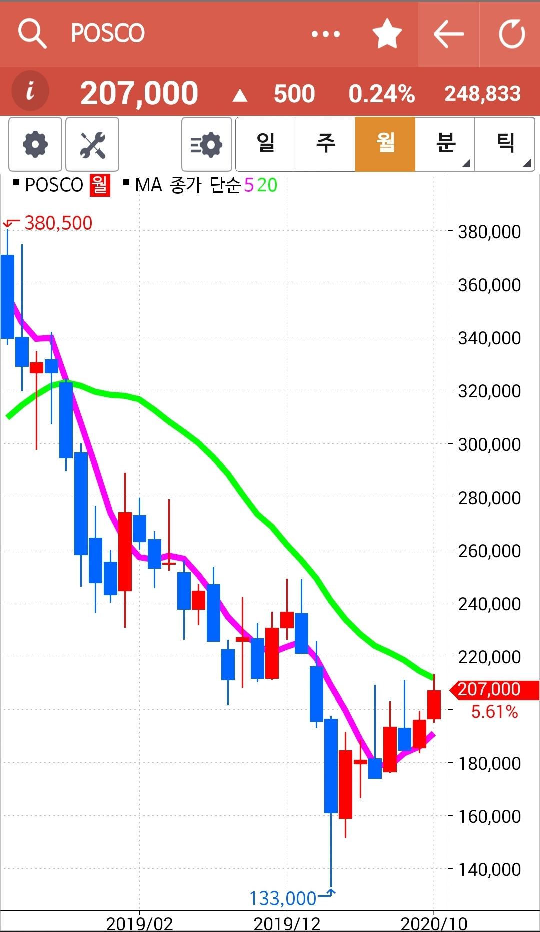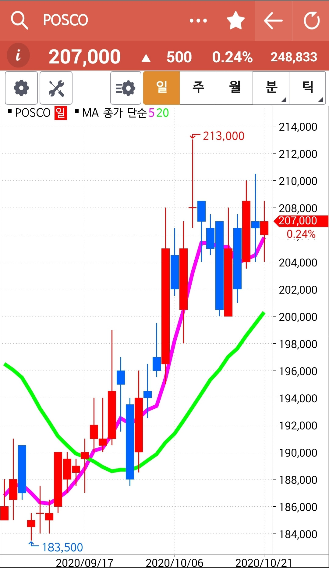 포스코 역시 5일선이 20일선 위에 있으므로 매수 유지다. 두 눈 부릅뜨고 5일선이 20일선 아래로 내려가는가만 지켜보리라. 파이팅!