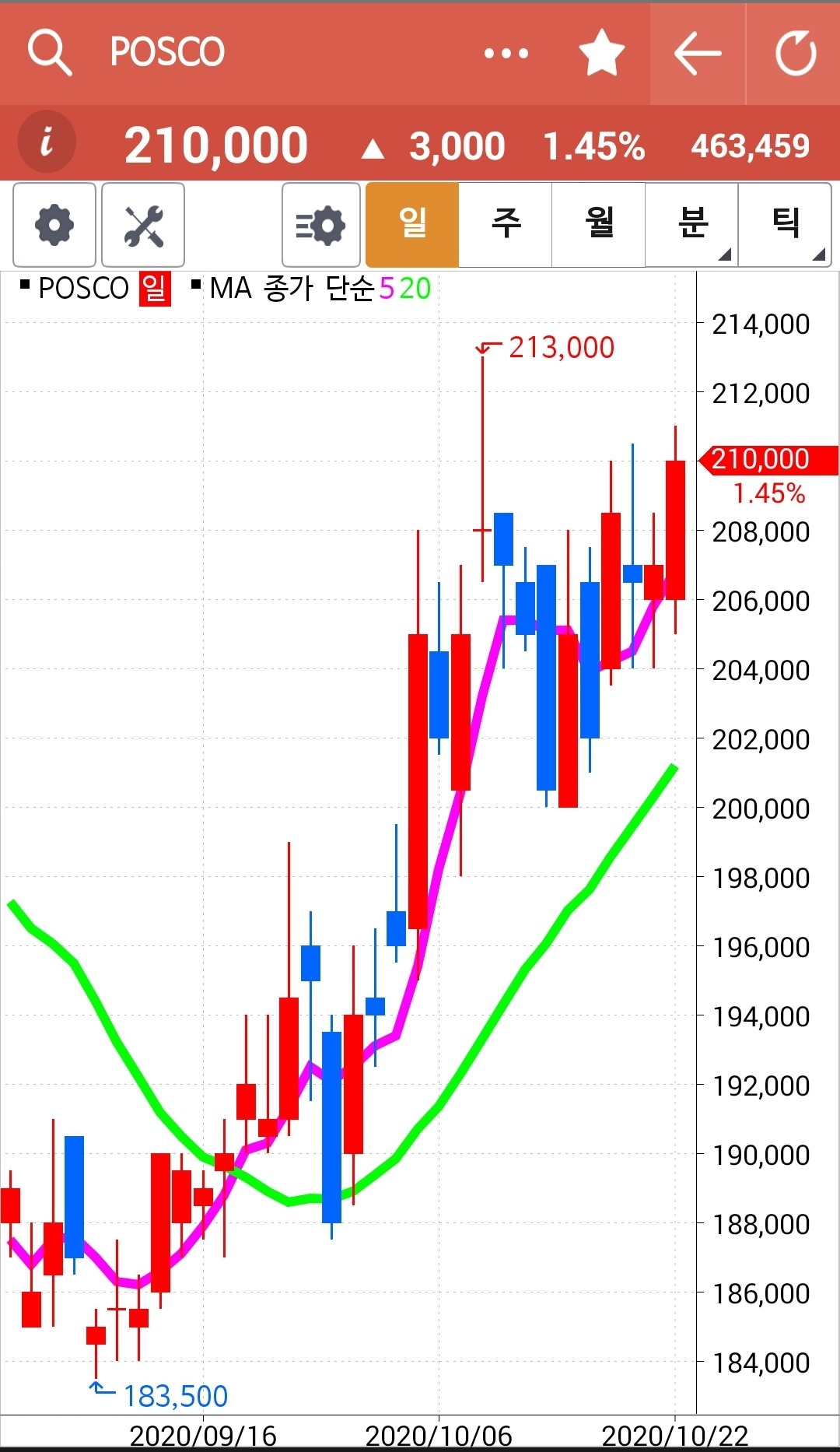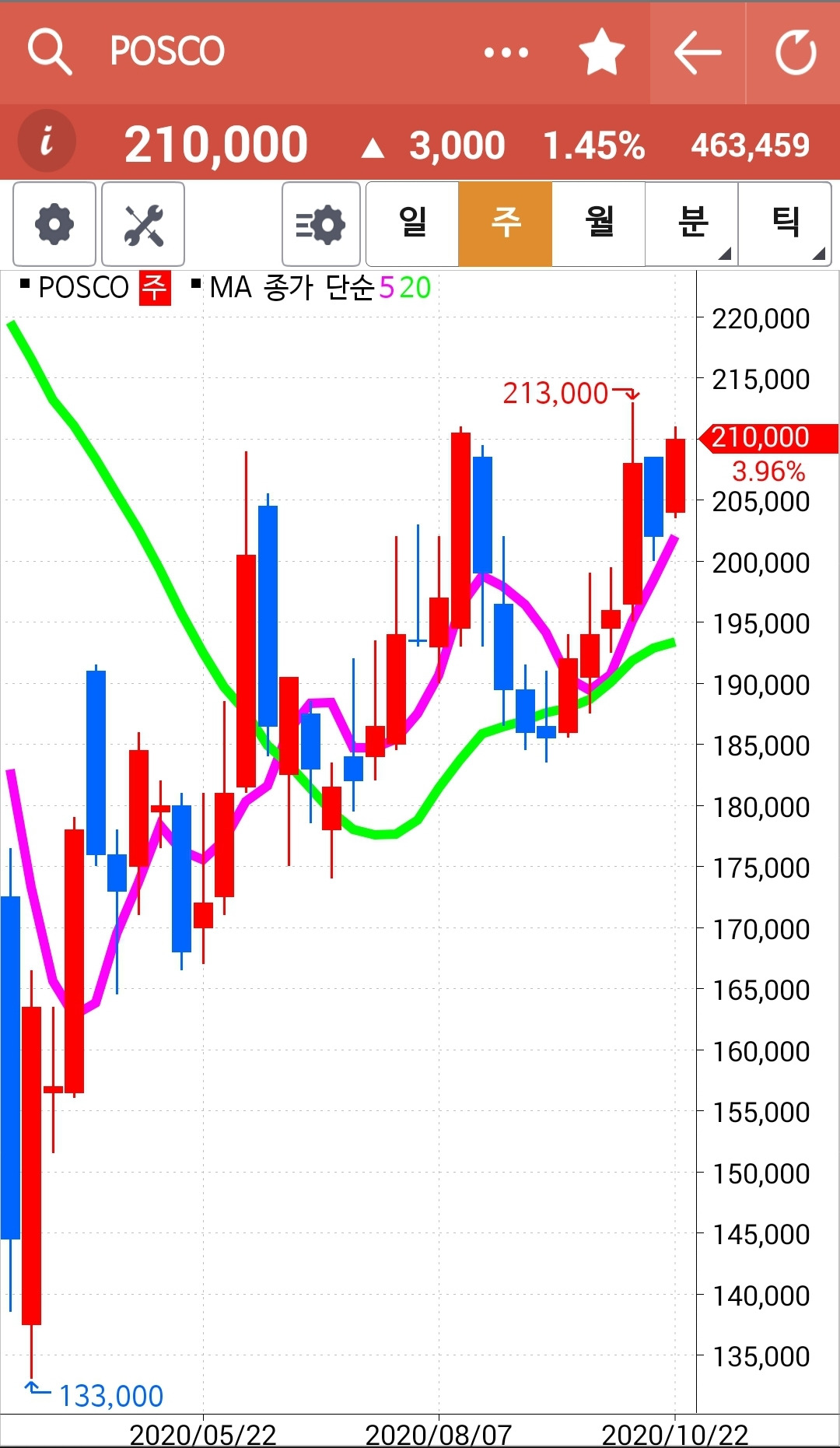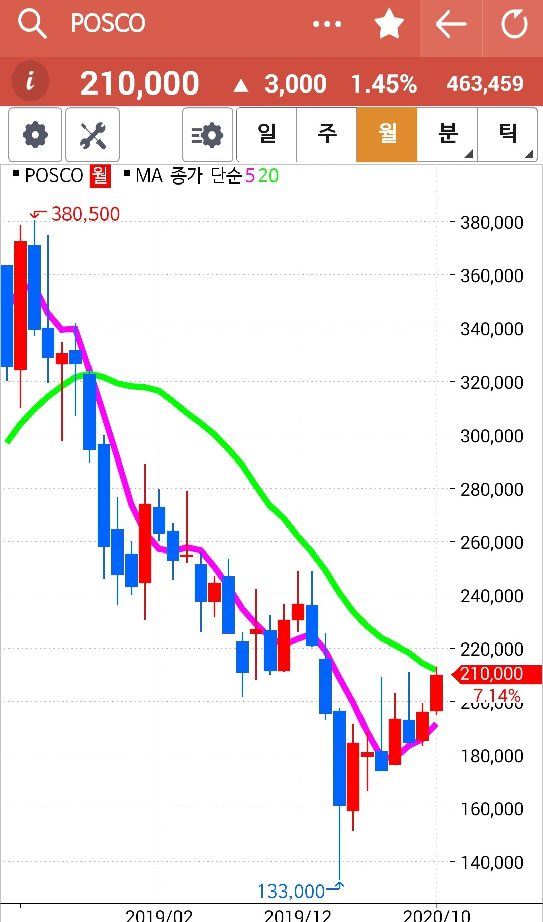 POSCO. 역시 5일선이 위에 있으니 올라가면 힘차게 올라간다. 주봉도 올라가고 있고 월봉은 20개월선을 돌파하려 하고 있다. 그렇구나. 20개월선에 딱 부딪쳤으니 조정은 불가피하겠구나. 전 고점을 훌쩍 뛰어넘으면 많이 위로 갈 텐데. 여하튼 5일선이 20일선 위에 있으므로 내가 할 일은 없음. 파이팅!