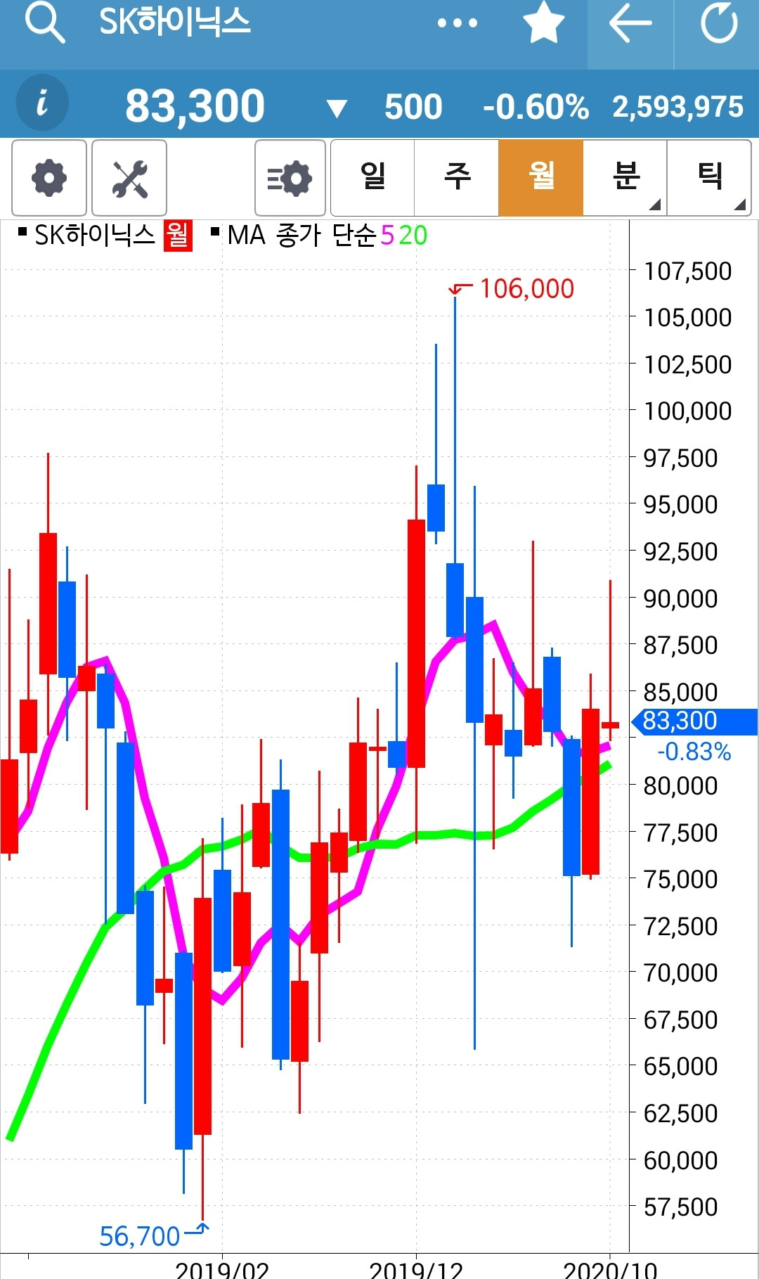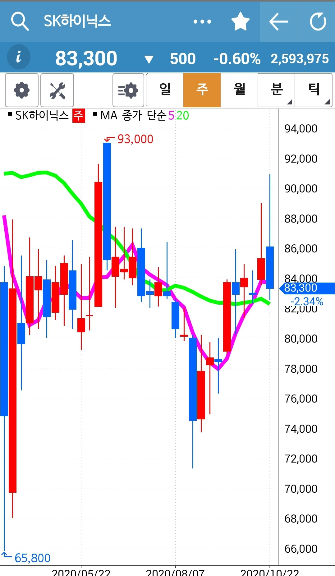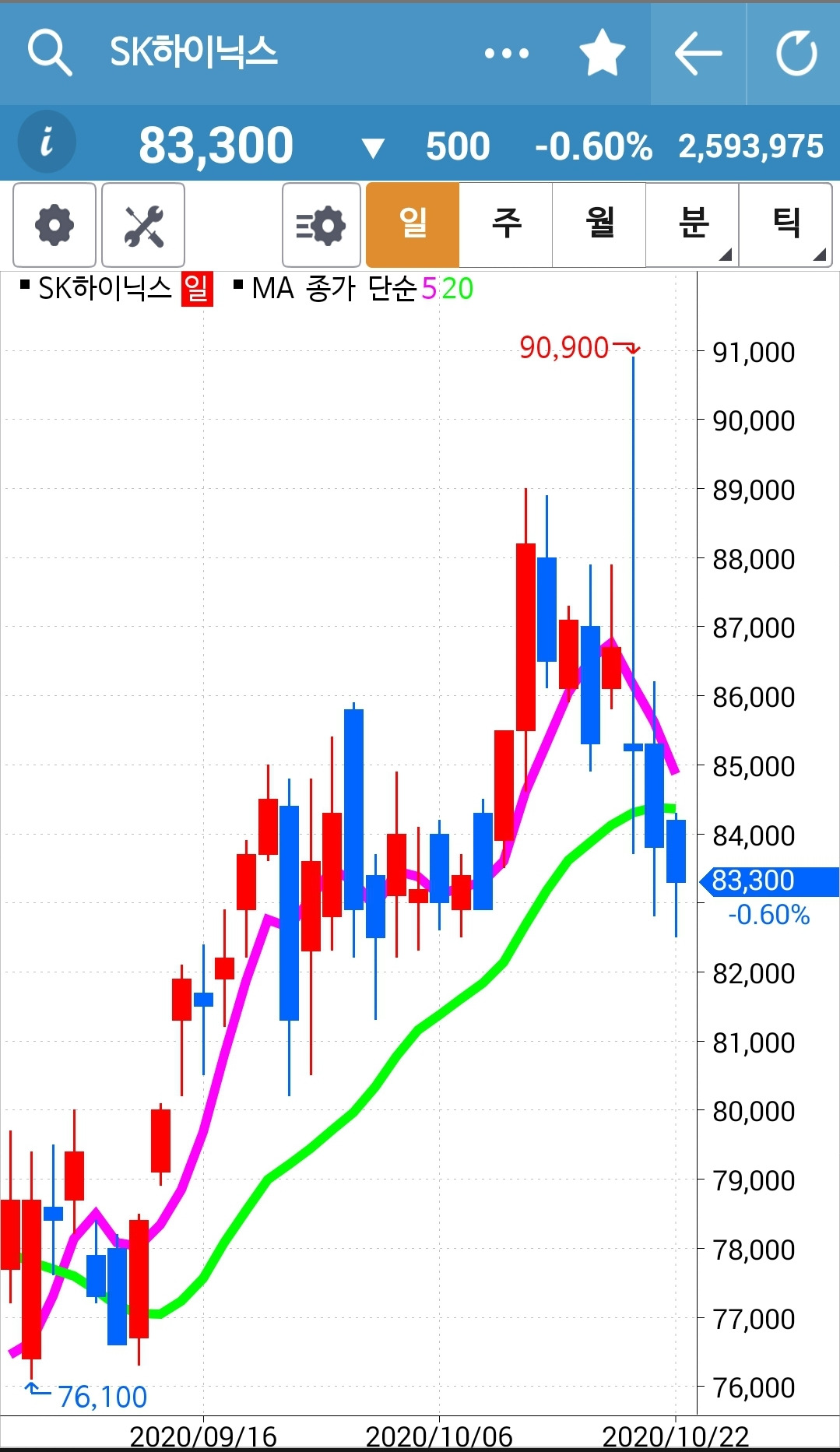 SK하이닉스. 조만간 5일선이 20일선 아래로 내려오겠다. 그러고 나서 충분히 빠졌으니 다시 올라갈 가능성이 참 많은데 어떡하나. 무얼 어떡해. 고민할 것 없어. 두 눈 부릅뜨고 지켜보다가 5일선이 20일선 아래로 내려가면 그때 손실이 얼마이건 간에 일단 나오는 것만 할 줄 알면 돼. 오케이. 파이팅! 난 잘할 수 있다.