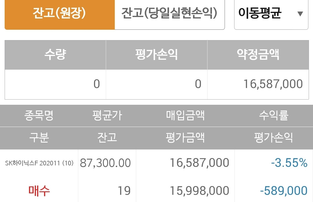 사진 3. 선물주식 잔고. 반토막 이상 손실 중. 그러나 난 잘못이 없다. 원칙을 지키고 있으니까. 언제고 5일선이 20일선 뚫고 내려갈 때 나오리라.