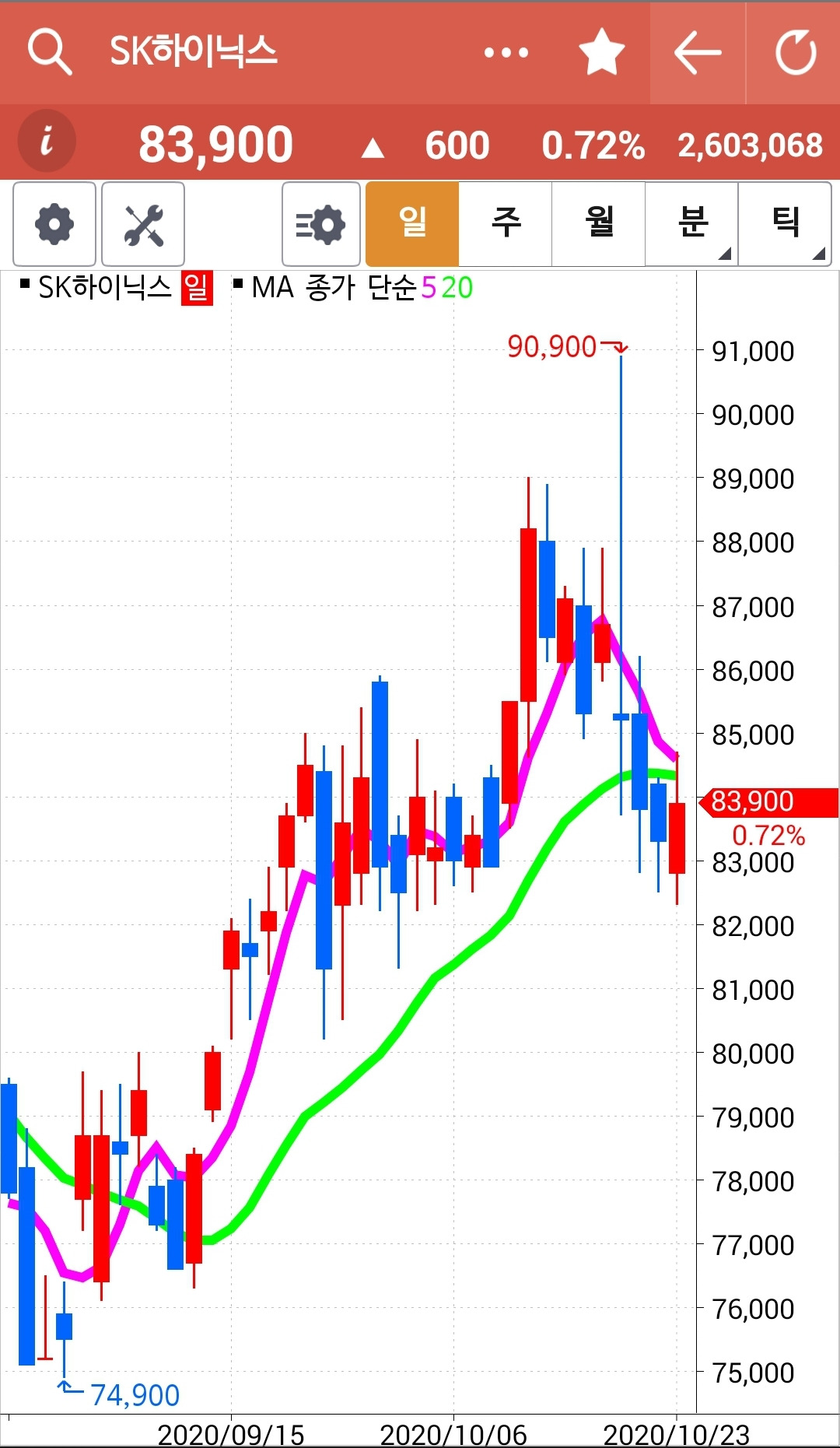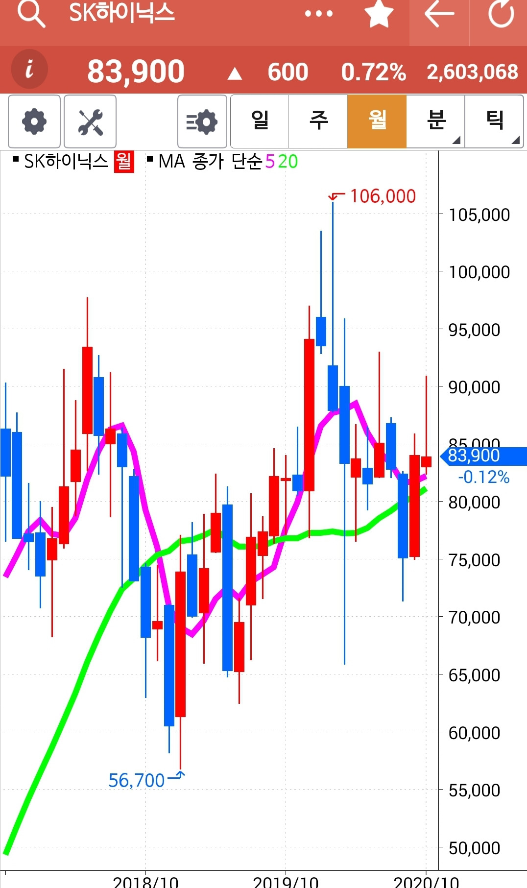 하이닉스. 그렇게 주야장천 내려오더니 아슬아슬이다. 조만간 5일선이 20일선을 뚫고 내려올 기세다. 아, 어쩌나? 이대로 꽝! 충돌이 일어날까? 하이고 오오오 주봉 월봉 모습은 괜찮은데 제발 20일선 뚫지 말고 위로 빵빵 올라가 주렴.