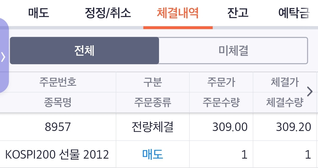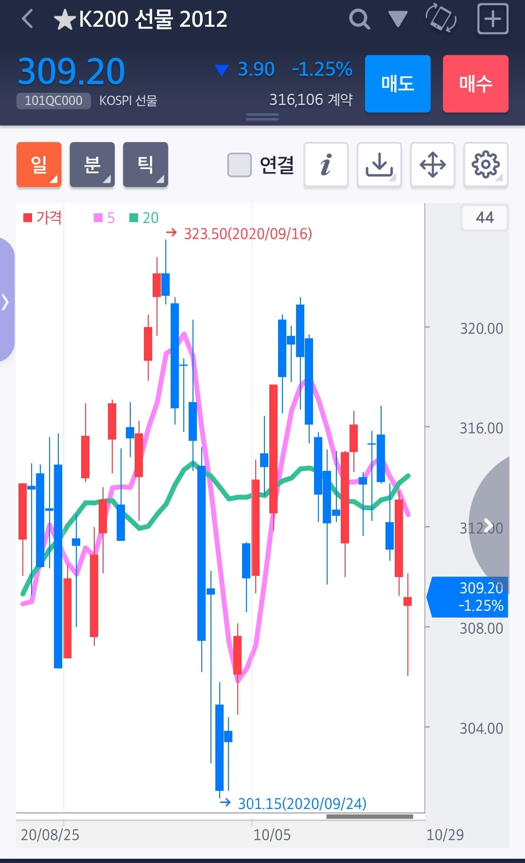 오늘 지수 선물 매수분을 309.20에 정리한 모습이다. 종가에 넉넉하게 309에 주문을 넣었고 그것은 309.20에 확실하게 정리되었다. 차트를 좀 볼까?