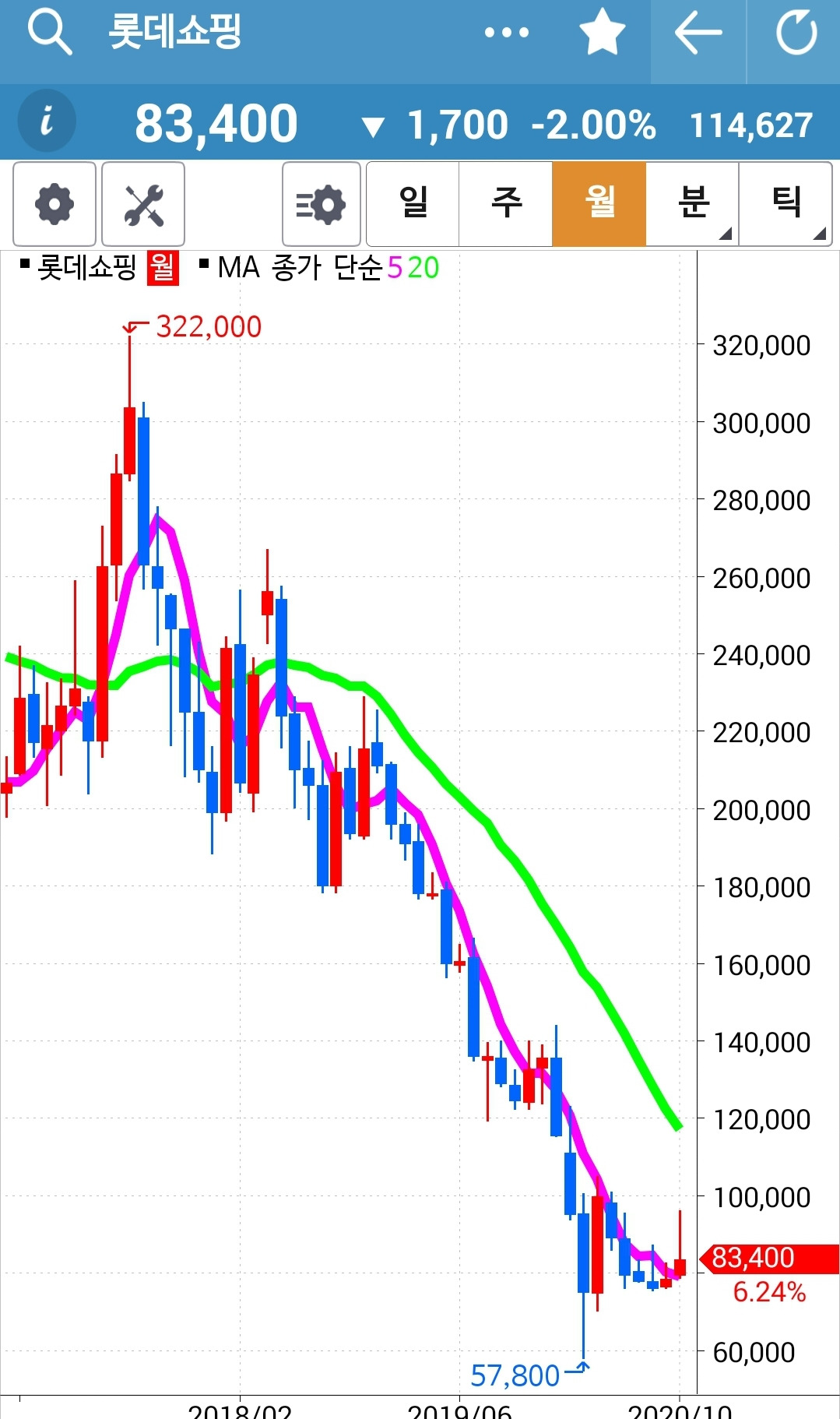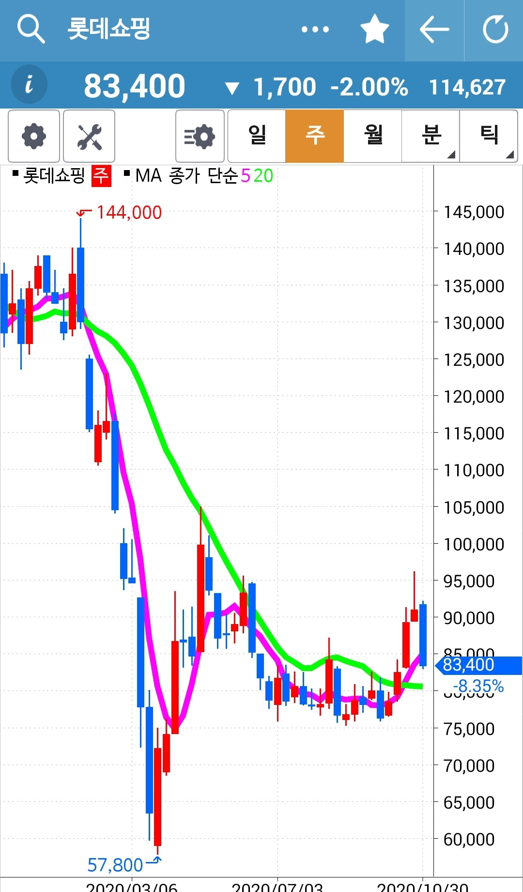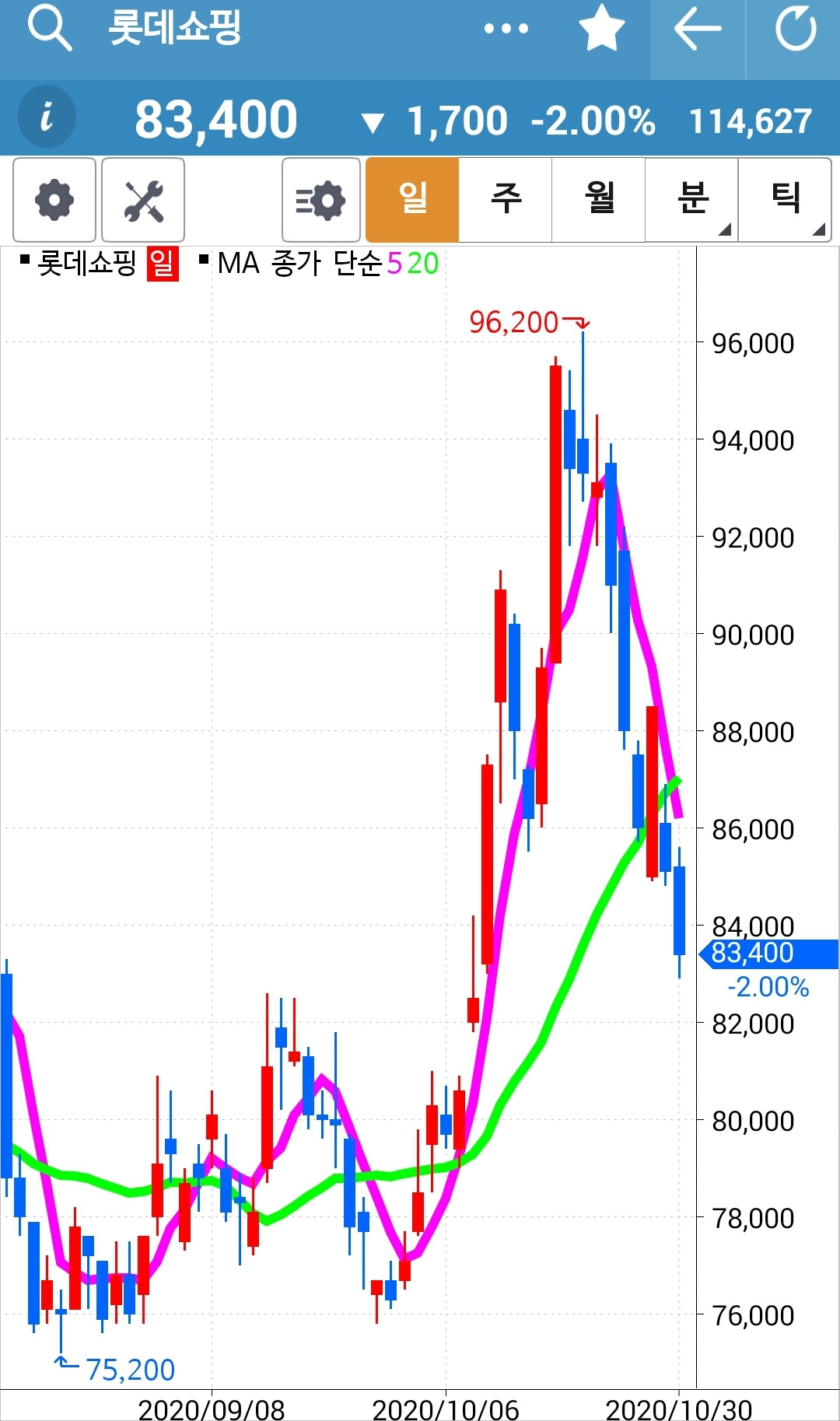 롯데쇼핑. 확실하게 5일선이 20일선 아래로 내려왔다. 아무 생각이 필요 없다. 그대로 매도다. 가격 불문 매도!