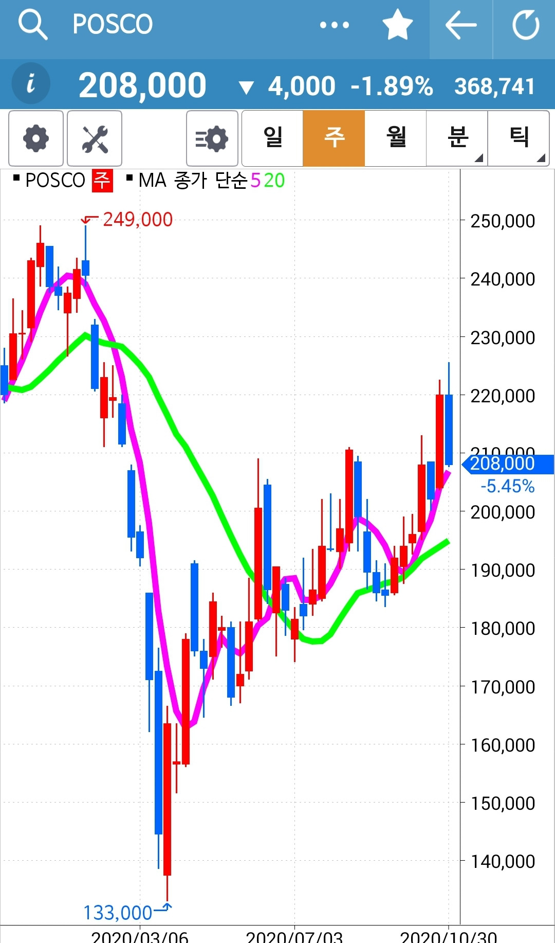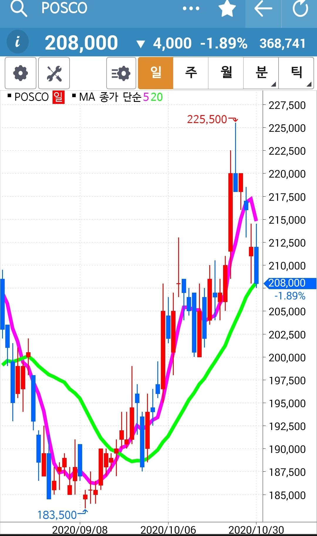 포스코도 영 맥을 못 춘다. 종합지수가 맥을 못 추면 당연히 모두 맥을 못 춘다. 5일선은 20일선 위에 있어 생존했지만 주가가 20일선까지 내려왔다.