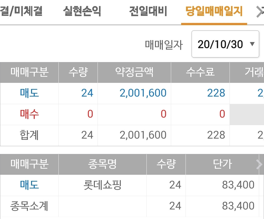 사진 2. 선물주식. 오늘 매매상황. 롯데쇼핑으로 빵빵 채워 넣었던 것을 5일선이 20일선을 뚫고 내려와 몽땅 매도했다.