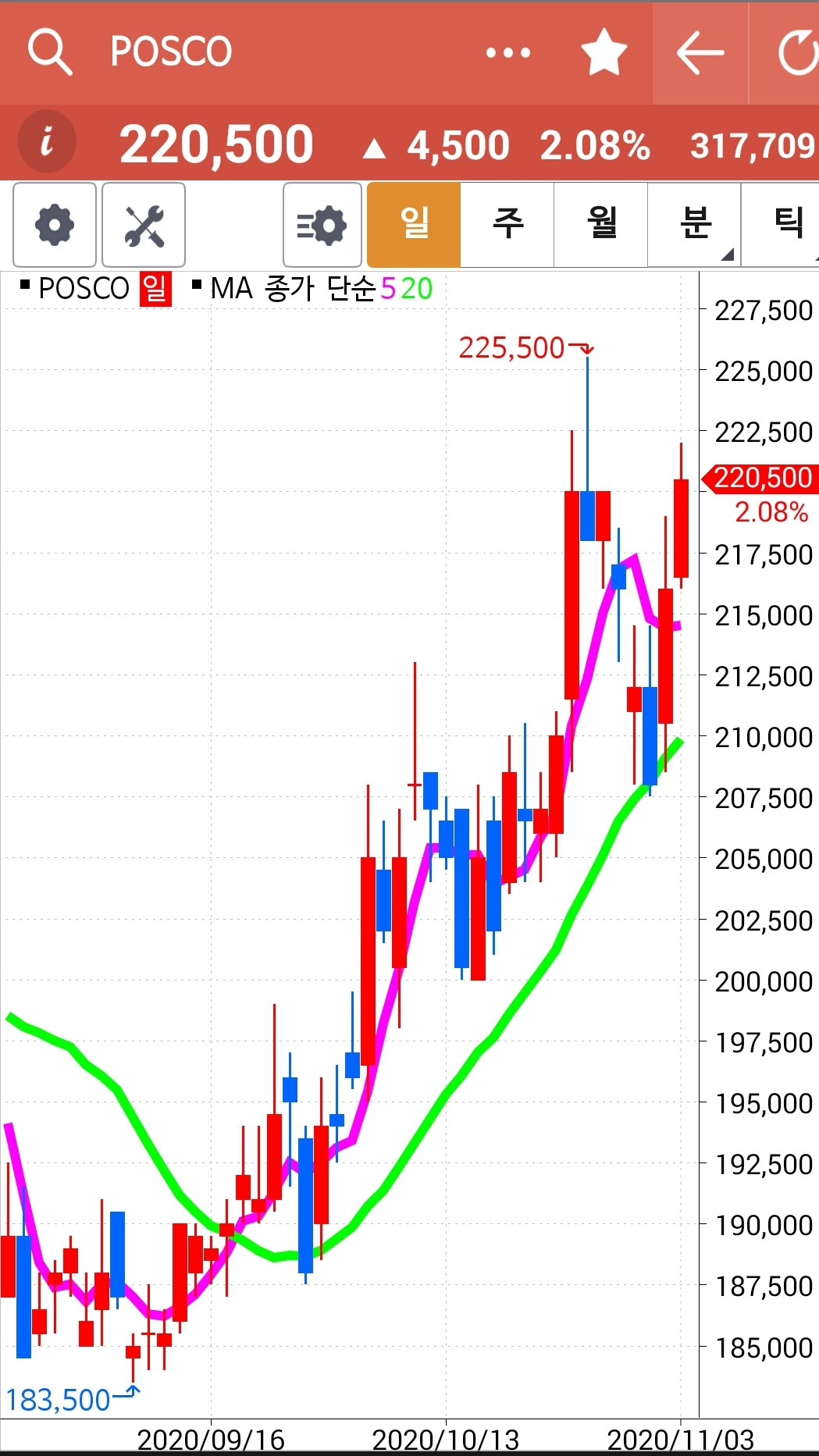 포스코. 5일선이 20일선 위에 있고 20일선까지 조정받았던 주가는 쭉쭉빵빵 잘 올라가고 있다. 주봉도 5 주선이 20 주선 위에 있으니 안심. 월봉은 주가는 20개월 선위로 올라섰고 5개월 선도 골든크로스를 향해가고 있으니 희망이 가득하다. 잘 따라가 보자. 파이팅!