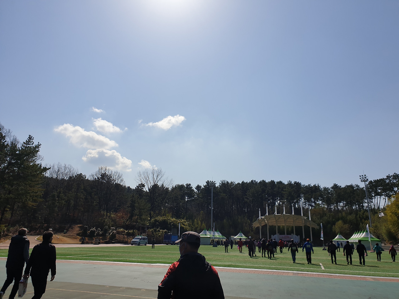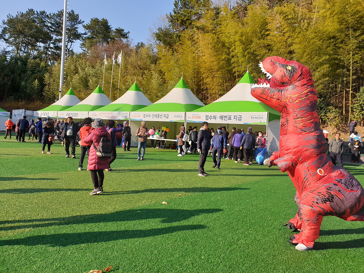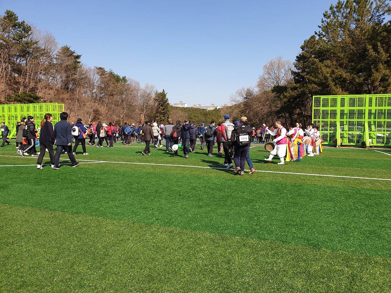 인조잔디가 파랗게 쫘악 깔려있는 축구장. 이미 접수대라고 쓰여 있는 곳에는 사람들이 길게 줄을 서 있다. 약속시간에 딱 맞춰 모두 참석. 하하 가기 싫다 했어도 나의 동원에 기꺼이 응해준 고마운 분들. 동료 중 한 분이 어디서 따끈따끈 맛있는 커피도 얻어온다. 부스마다 생수 나누어 주는 곳. 커피 주는 곳, 뻥 투기 주는 곳, 건강검진해주는 곳 여러 가지가 준비되어 있다. 커피를 마시며 접수하려 줄을 서 있는데 하하 무언가 큰 대회에 참가한 것 같아 막 신이 난다. 접수대란 별거 아니고 스티커로 된 번호표를 한 장씩 나누어주며 잃어버리지 마세요 중요한 겁니다~ 한다. 나중에 행운권 추첨할 때 이 번호로 한다며 잘 챙기란다. 우리는 가슴에 팍팍 그 커다란 번호를 붙이고 흐뭇하다. 아 그런데 날씨가 너무 쌀쌀하다.