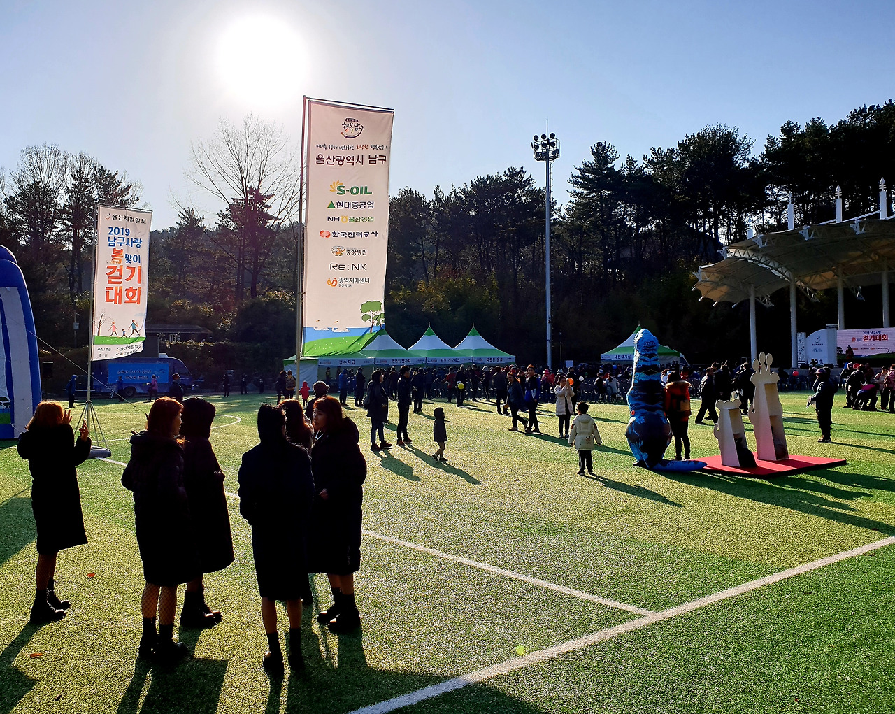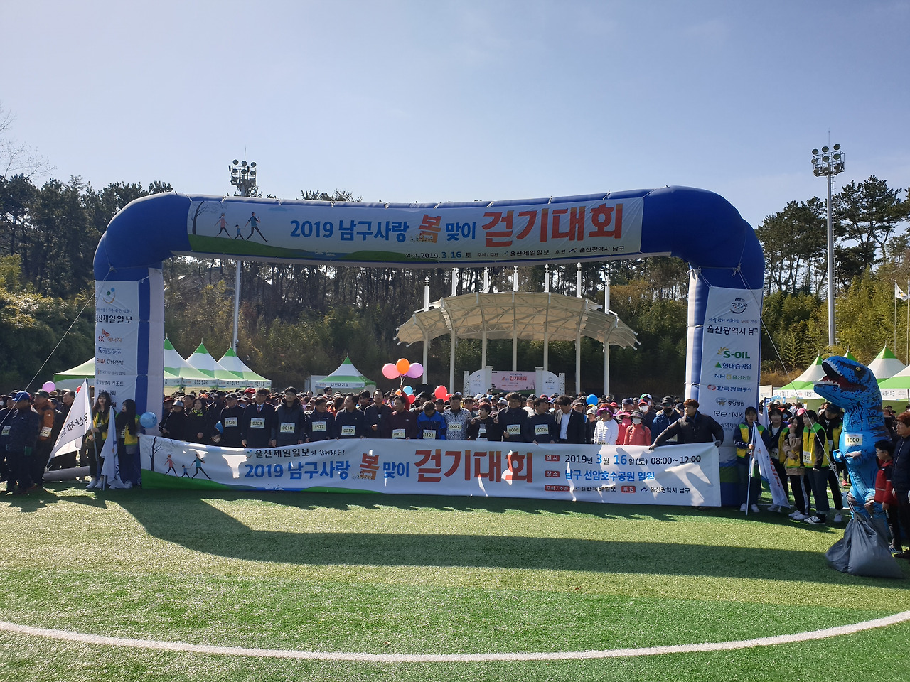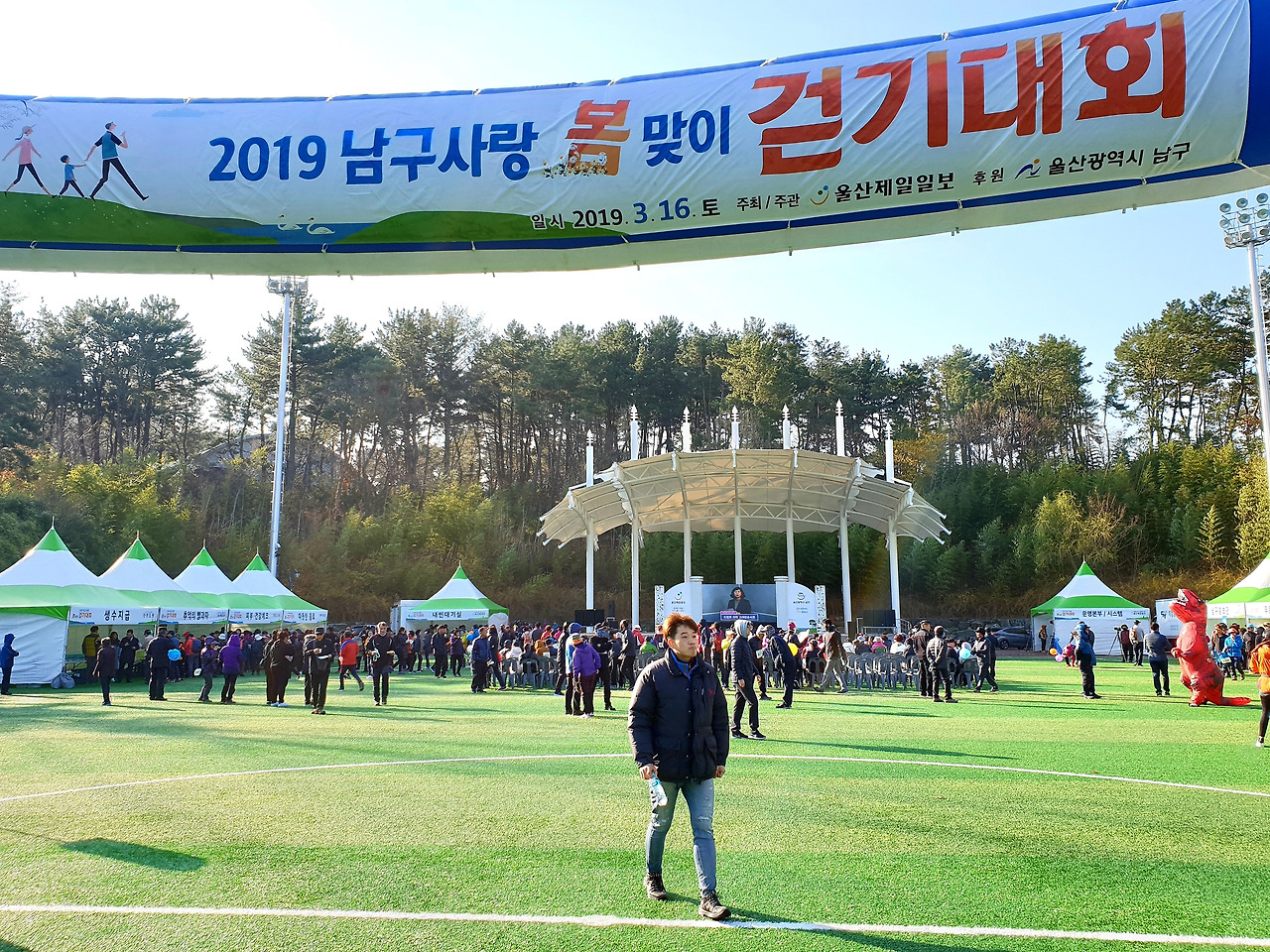 인조잔디가 파랗게 쫘악 깔려있는 축구장. 이미 접수대라고 쓰여 있는 곳에는 사람들이 길게 줄을 서 있다. 약속시간에 딱 맞춰 모두 참석. 하하 가기 싫다 했어도 나의 동원에 기꺼이 응해준 고마운 분들. 동료 중 한 분이 어디서 따끈따끈 맛있는 커피도 얻어온다. 부스마다 생수 나누어 주는 곳. 커피 주는 곳, 뻥 투기 주는 곳, 건강검진해주는 곳 여러 가지가 준비되어 있다. 커피를 마시며 접수하려 줄을 서 있는데 하하 무언가 큰 대회에 참가한 것 같아 막 신이 난다. 접수대란 별거 아니고 스티커로 된 번호표를 한 장씩 나누어주며 잃어버리지 마세요 중요한 겁니다~ 한다. 나중에 행운권 추첨할 때 이 번호로 한다며 잘 챙기란다. 우리는 가슴에 팍팍 그 커다란 번호를 붙이고 흐뭇하다. 아 그런데 날씨가 너무 쌀쌀하다.