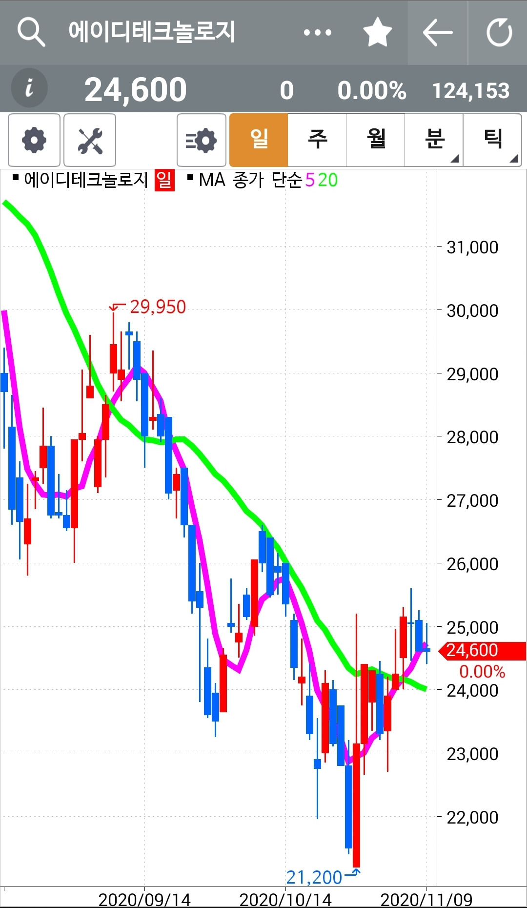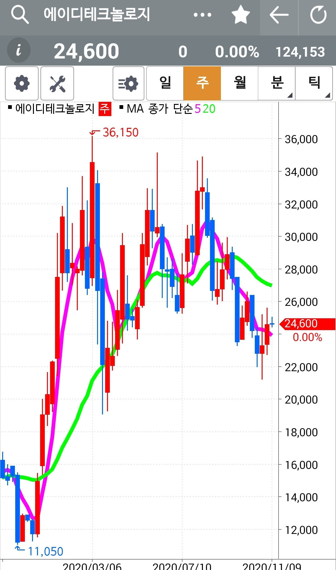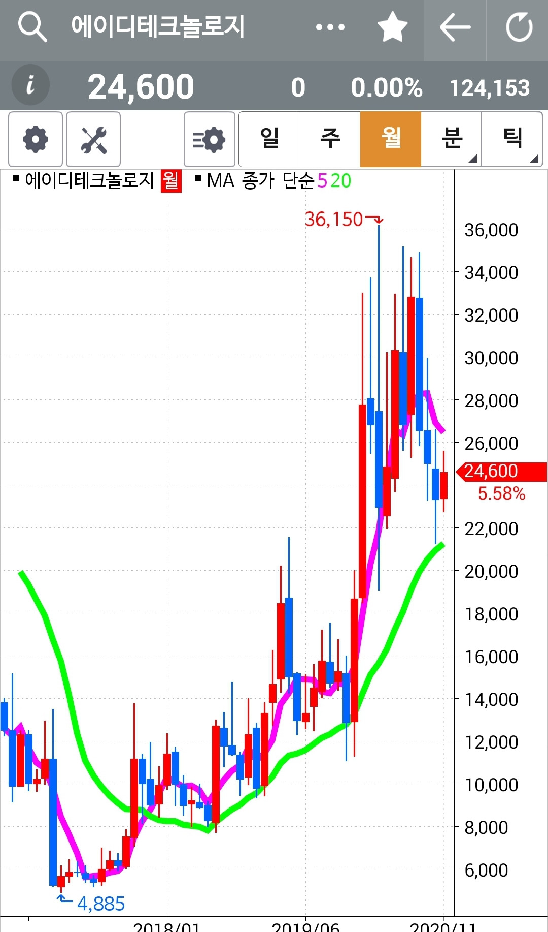 이름도 몰라요 성도 몰라~ 하하 바로 그런 느낌이다. 그렇다고 이종목에 관해 뒤져보지도 않는다. 에이디테크놀로지를 5일선이 20일선 뚫고 올라왔다고 덜컥 사버렸다. 그러나 횡보 장이라 해야 할까 주봉에선 5 주선이 아직 20 주선 아래 있다. 그래서 강하게 힘을 못 받는 것 같다. 그러나 월봉을 보면 또 매력적이다. 꾸준히 올라가고 있기 때문이다. 아래로 꺾어진 5개월선은 20개월선에 부딪고 다시 위로 튀어 오르려 하고 있다. 그래. 걱정할 거 없다. 이름도 몰라요 성도 몰라도 된다. 내가 아는 건 단 한 가지. 난 아무것도 몰라요 5일선이 20일선 아래면 매도할 뿐야요~ 그러니까 5일선이 20일선을 뚫고 내려가는가만 눈을 부릅뜨고 지켜볼 일이다. 파이팅! 기죽지 말자.
