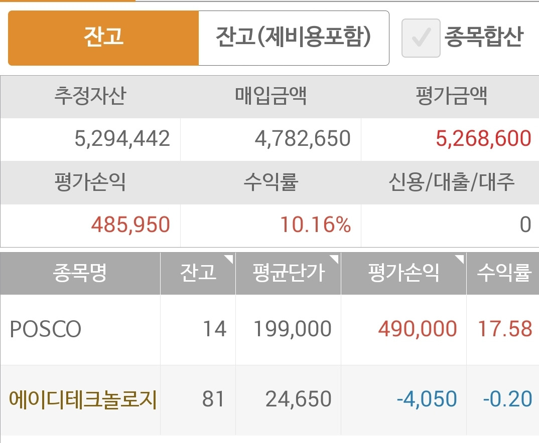 포스코를 보시라. 선물 주식도 아닌데 꼴랑 200만 원 정도 투자해서 49만 원의 수익을 올렸으니 말이다. 그때 한꺼번에 모든 돈을 투자할 걸 이름도 생소한 에이디테크놀로지를 사 고생이다. 손실 중이라니. 에고 고고. 다음엔 꼭 잘 아는 주식으로 채워 넣도록 하자. 파이팅.