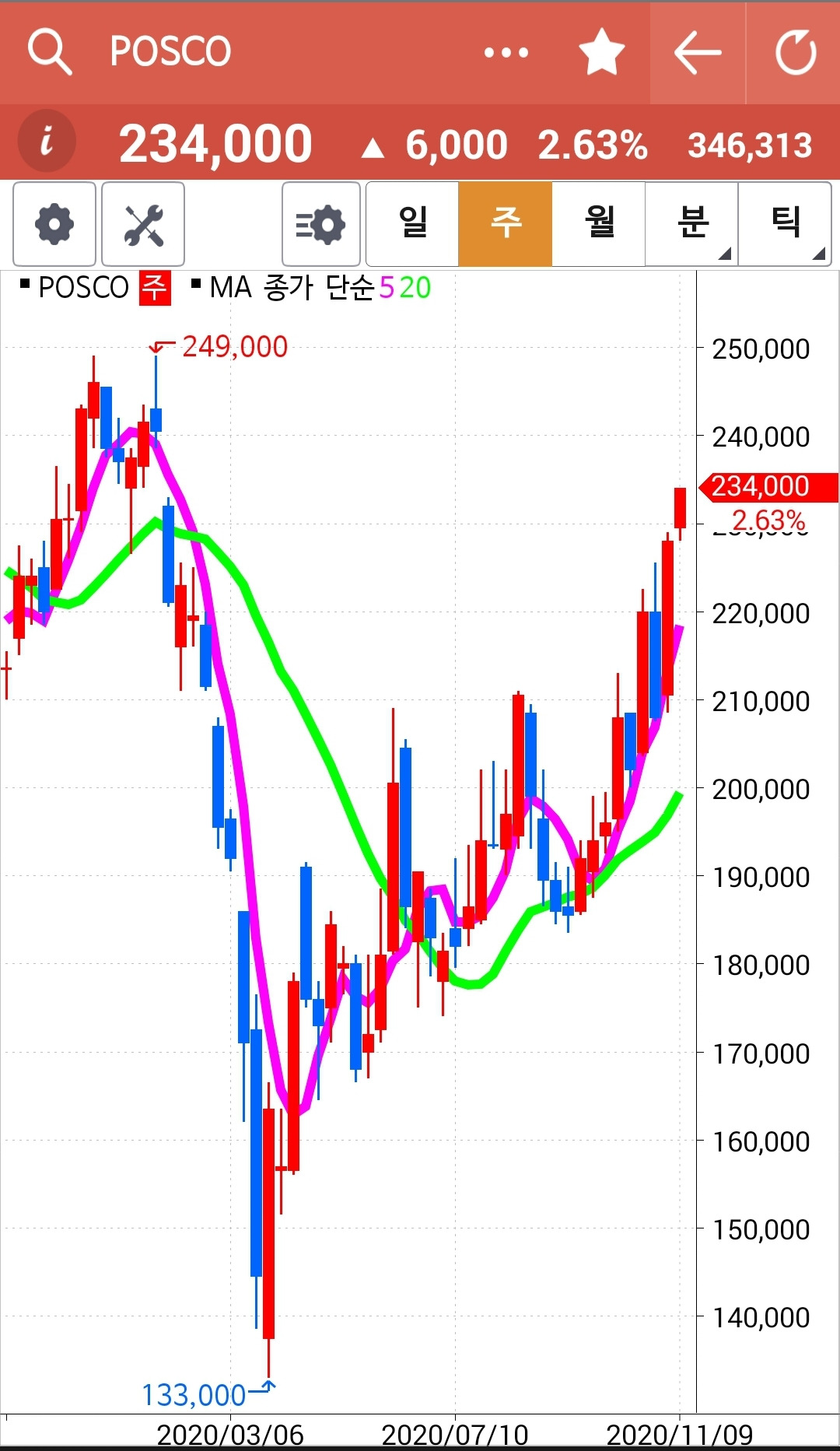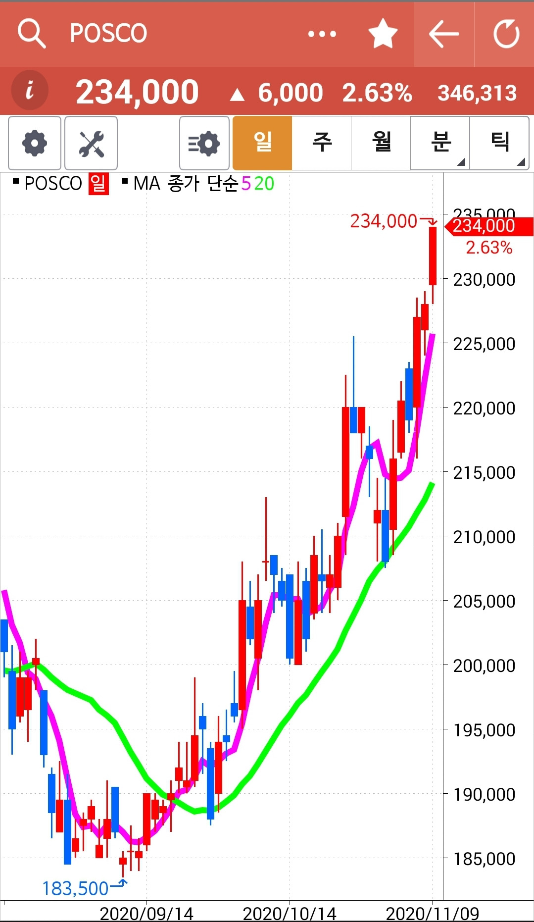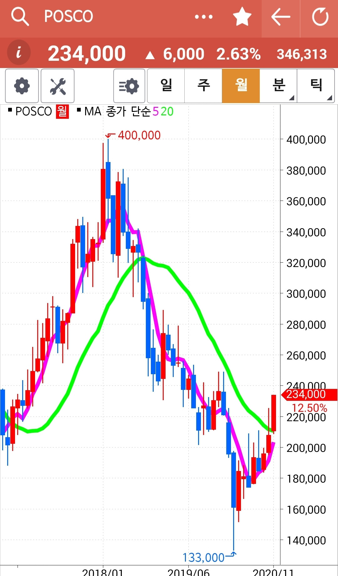 포스코. 이것이 바로바로 일봉 주봉 월봉 모두 위로 향할 때의 위력이라 할까. 물론 월봉은 아직 주가만 20일선 위로 올라왔지 5개월선이 20개월선 위로 올라온 상황은 아니다. 그래도 5개월선이 위를 향하고 있어서일까 그 힘이 대단하다. 오늘도 빵! 올랐다. 흠 다른 건 생각 말자. 수익을 챙기려 말고 꽝! 충돌이 일어나는 가에만 신경 쓰자. 파이팅!!!