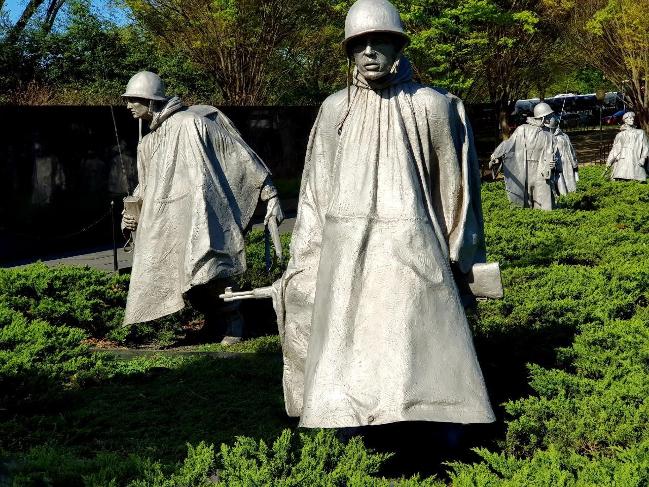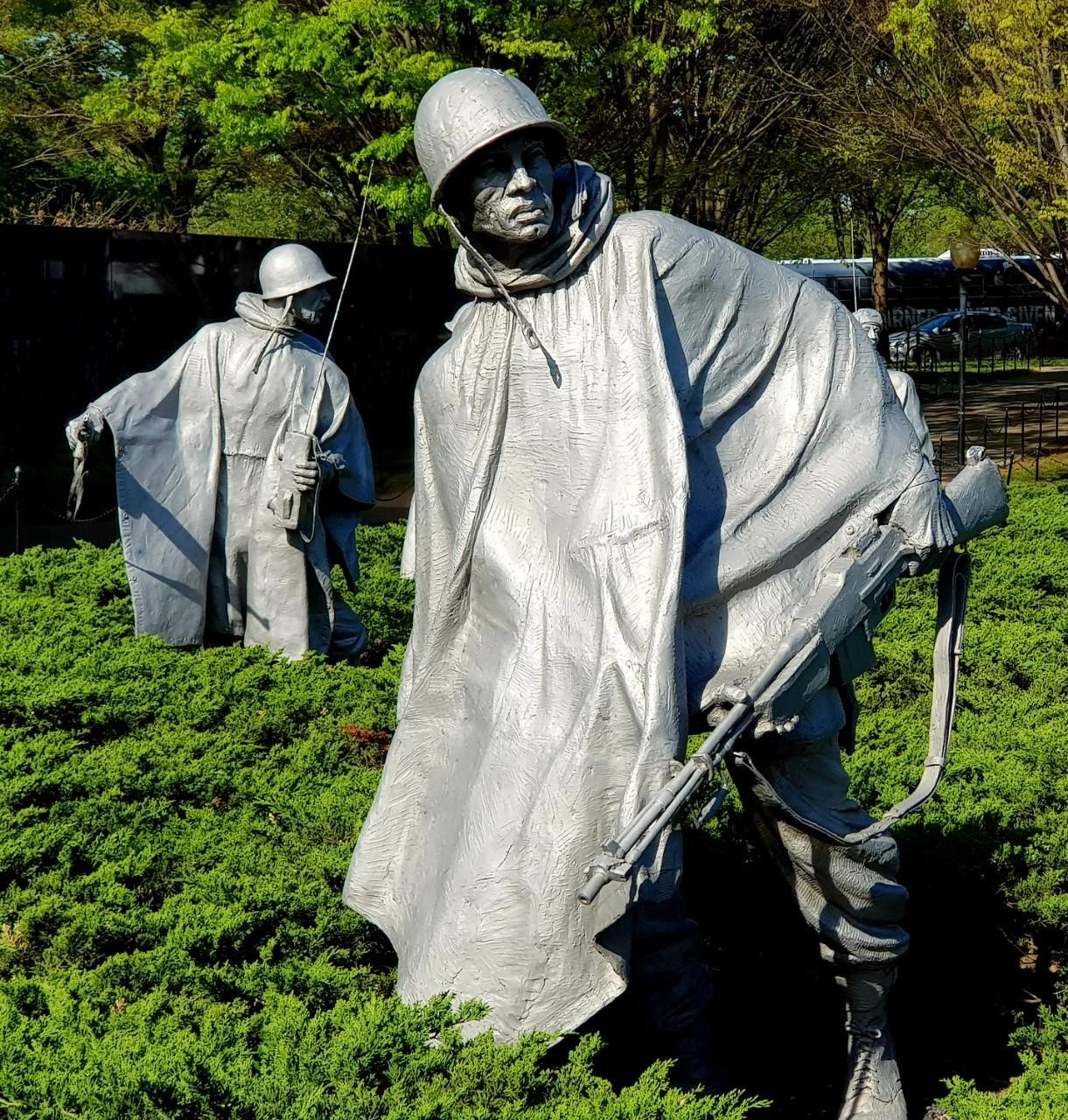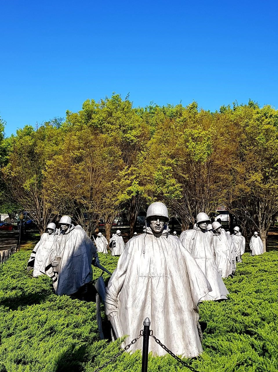 한국전 참전 용사비 Korean War Memorial 6.25 전쟁 때 우리나라에 와서 싸워 준 미군 병사들을 기념하는 공원이다. 클린턴 대통령 시절인 1995년 7월 27일 김영삼 대통령 방미 때 제막되었다. 19명의 병사가 성조기를 향해 돌진하고 있는데 육군, 공군, 해군, 해병대가 다 있고 백인, 흑인, 히스패닉계도 다 있다. 동쪽엔 워싱턴 대통령의 기념비 오벨리스크, 서쪽에는 링컨 대통령 기념관, 탁 트인 공간 삼각형과 원형이 맞물린 구도. 그 삼각 꼭짓점에 미국 국기가 요케 펄펄 휘날리고 있다.