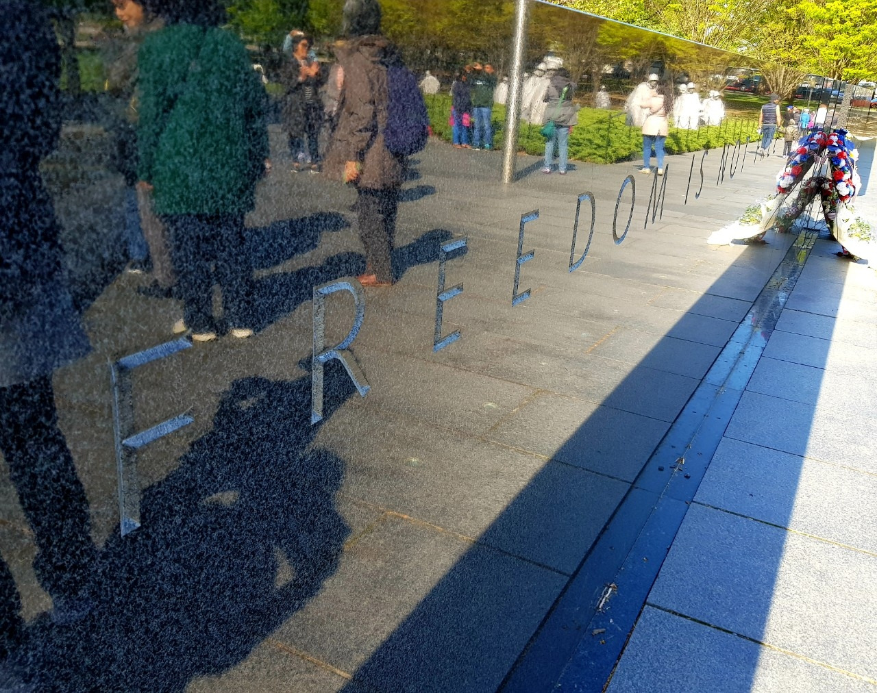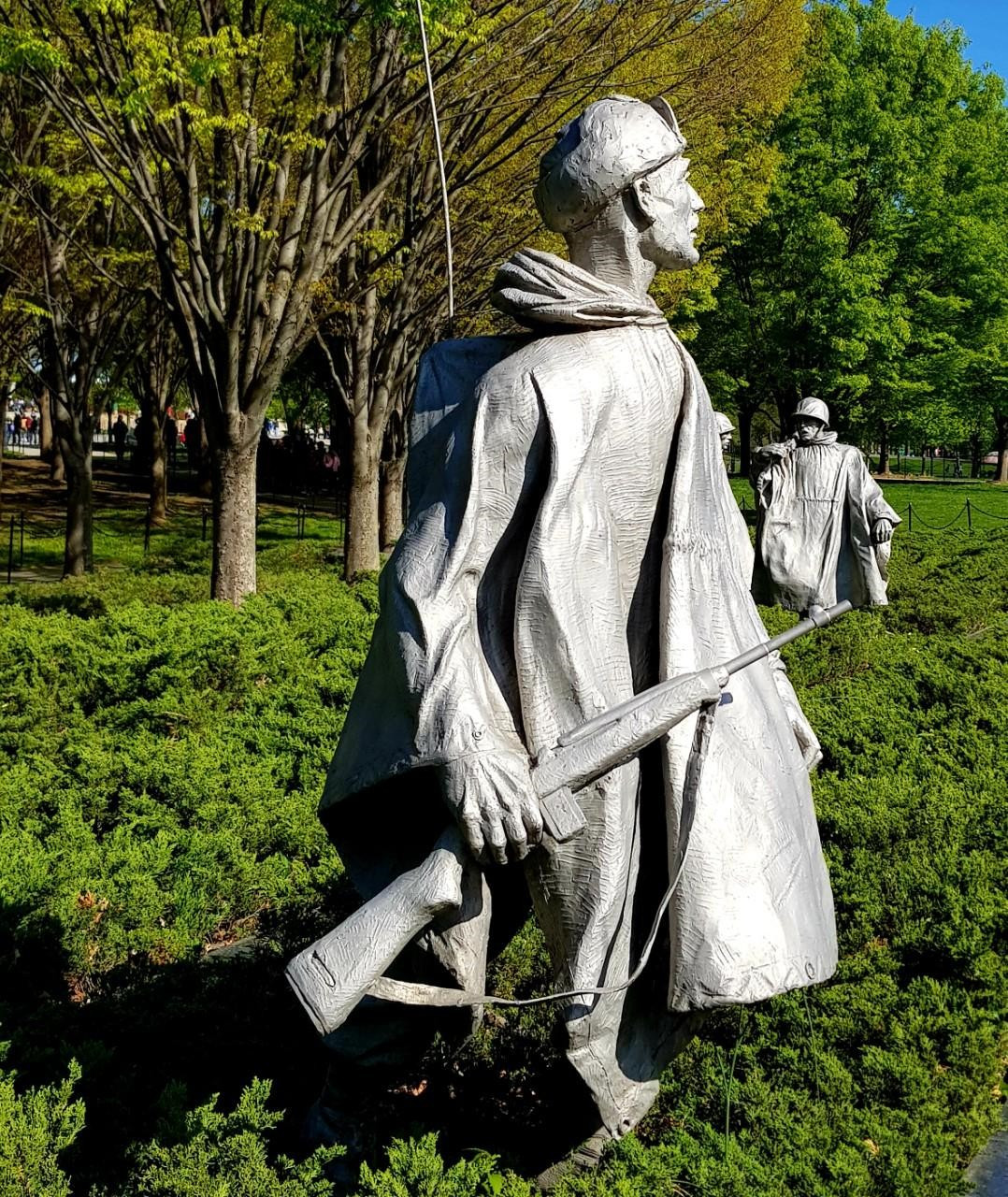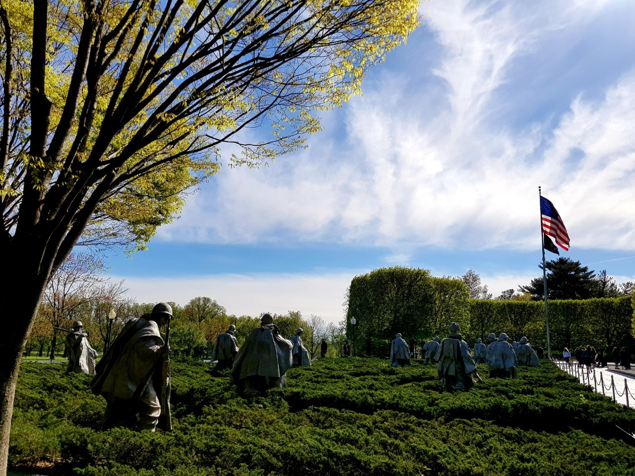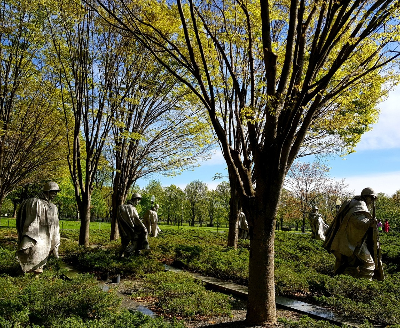 한국전 참전 용사비 Korean War Memorial 6.25 전쟁 때 우리나라에 와서 싸워 준 미군 병사들을 기념하는 공원이다. 클린턴 대통령 시절인 1995년 7월 27일 김영삼 대통령 방미 때 제막되었다. 19명의 병사가 성조기를 향해 돌진하고 있는데 육군, 공군, 해군, 해병대가 다 있고 백인, 흑인, 히스패닉계도 다 있다. 동쪽엔 워싱턴 대통령의 기념비 오벨리스크, 서쪽에는 링컨 대통령 기념관, 탁 트인 공간 삼각형과 원형이 맞물린 구도. 그 삼각 꼭짓점에 미국 국기가 요케 펄펄 휘날리고 있다.