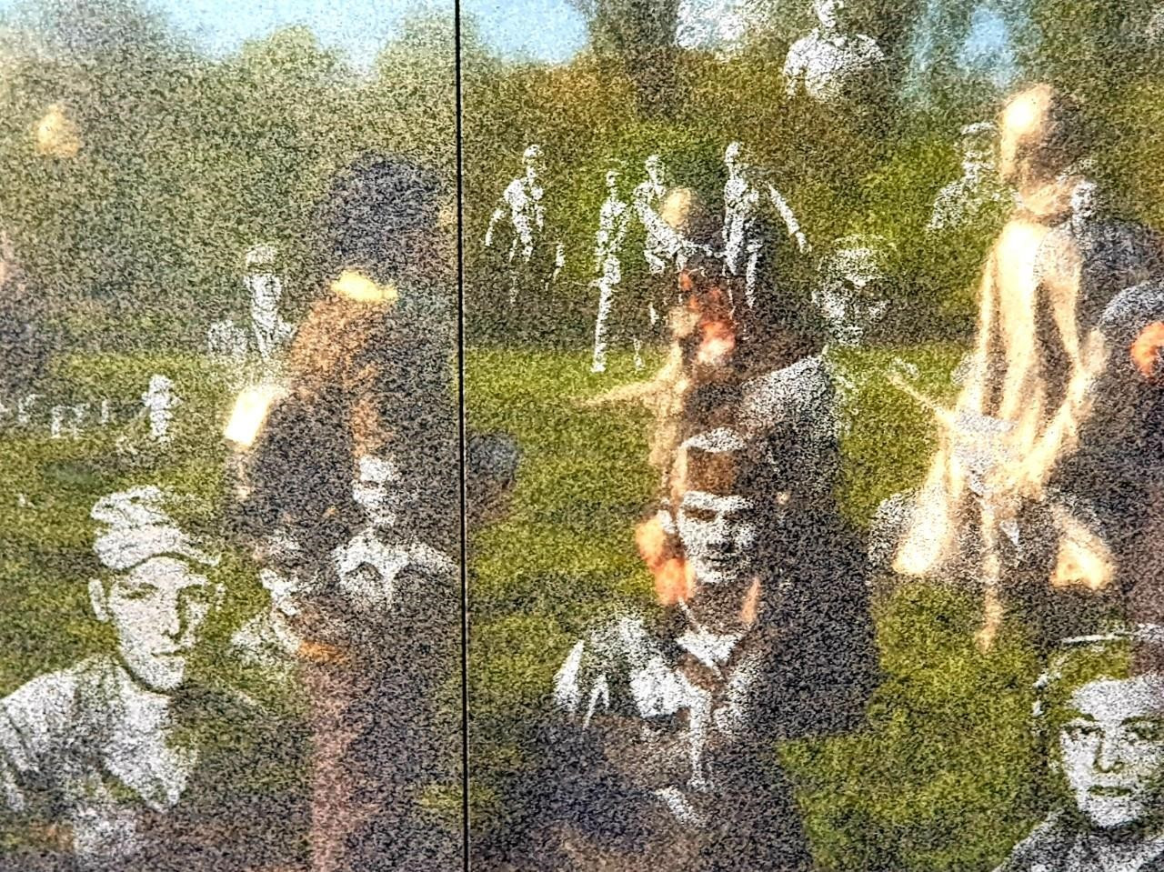 그 앞에 있는 19명의 군인 동상이 반사되어 합쳐진다. 그래서 본래 있는 19명의 병사와 함께 38명의 병사가 된다. 즉, 38선을 의미하는 숫자 38이 만들어지는 순간이다. 유엔의 벽을 기념하며 다 같이~