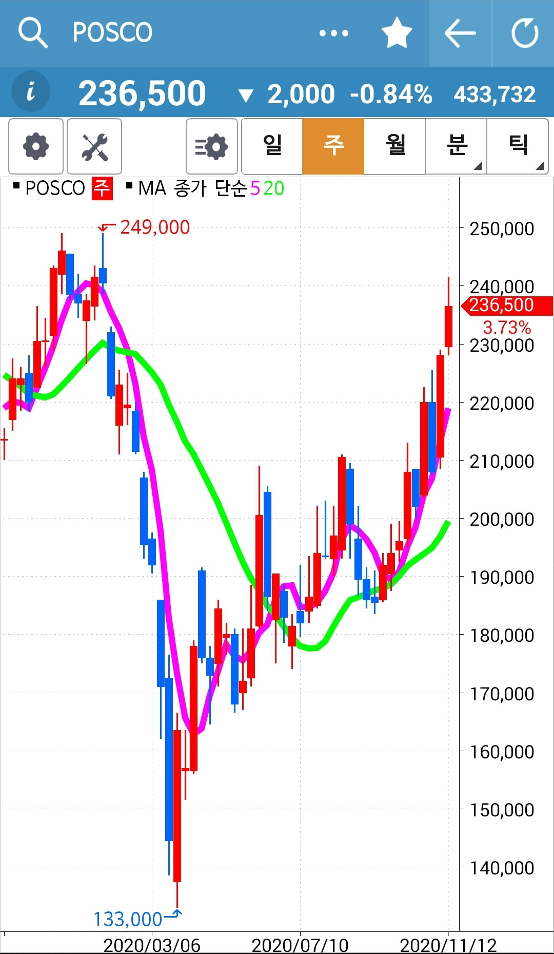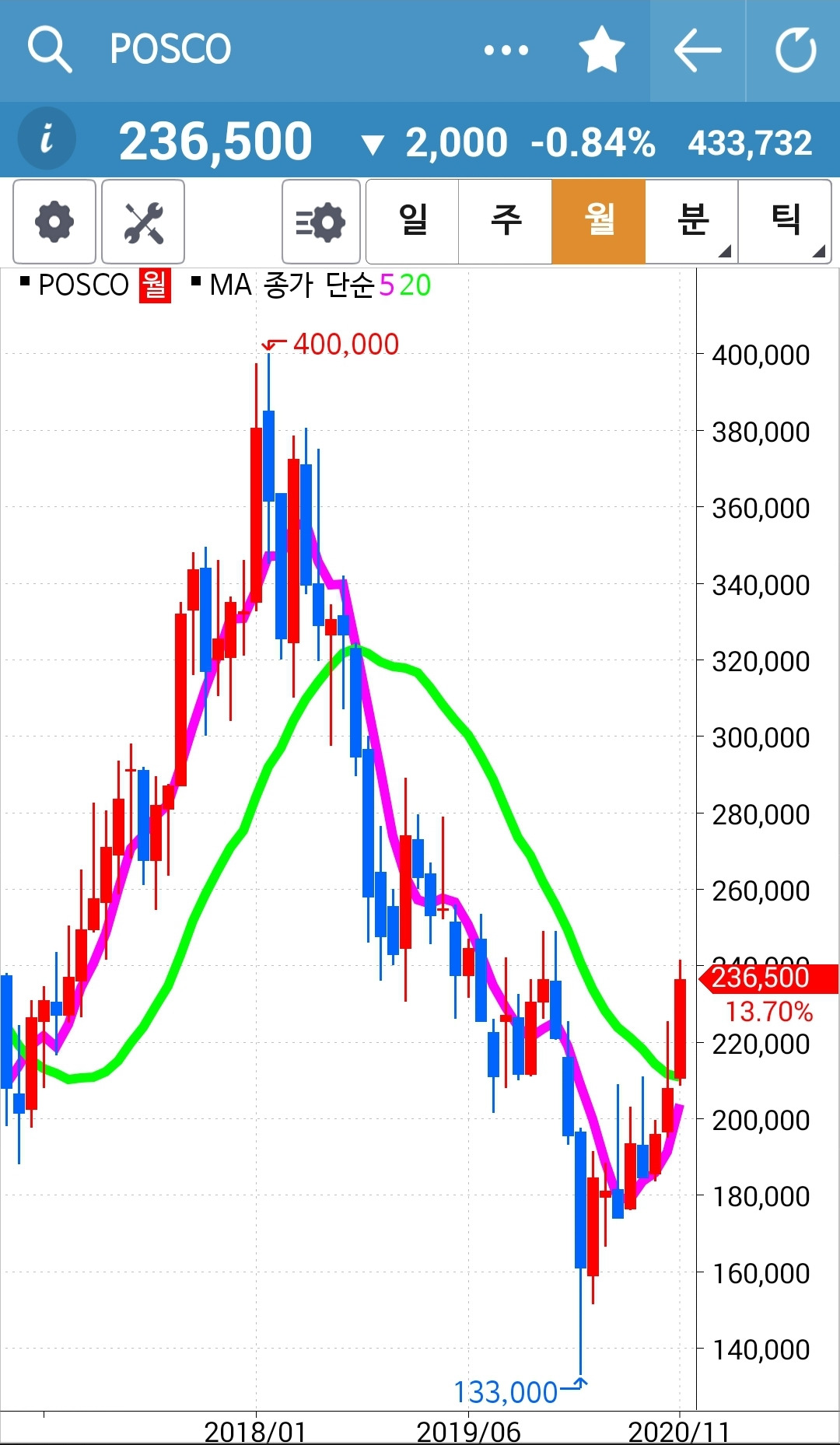 오늘 나는 새로운 시도를 했다. 대원칙에 어긋나는 건 아니다. 5일선이 20일선 위에 있는데 매도를 한다든가 5일선이 20일선 아래 있는데 매수하지만 않는다면 나의 대 원칙은 위배한 게 아니다. 언니~ 수익 좀 챙겨요. 다 빼주지 말고. 수익이 나도 챙기지 않는 나를 보며 동생들은 원성이 자자했다. 이익이 나면 일단 챙기고 보라고요. 오늘 그 말을 들었다. 그러니까 포스코가 전혀 5일선과 20일선의 충돌이 일어나지도 않았는데 난 매도를 했다. 전일 고점을 뚫지 못했고 전일 저점을 뚫고 내려왔기에 일단 도망치기로 했다. 도망쳤다. 즉 수익을 챙겼다. 그러나 내 방식은 아니다. 그래도 해봤다.