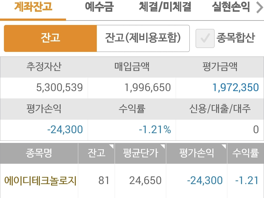 사진 1. 총 500만 원 투자에 30만 원 수익이다. 에이디테크놀로지가 계속 손실이다. 그래도 아직은 5일선이 위에 있으니까 가만히 있는다. 포스코는 정리해서 나의 계좌엔 에이디 테크놀로지뿐이다.