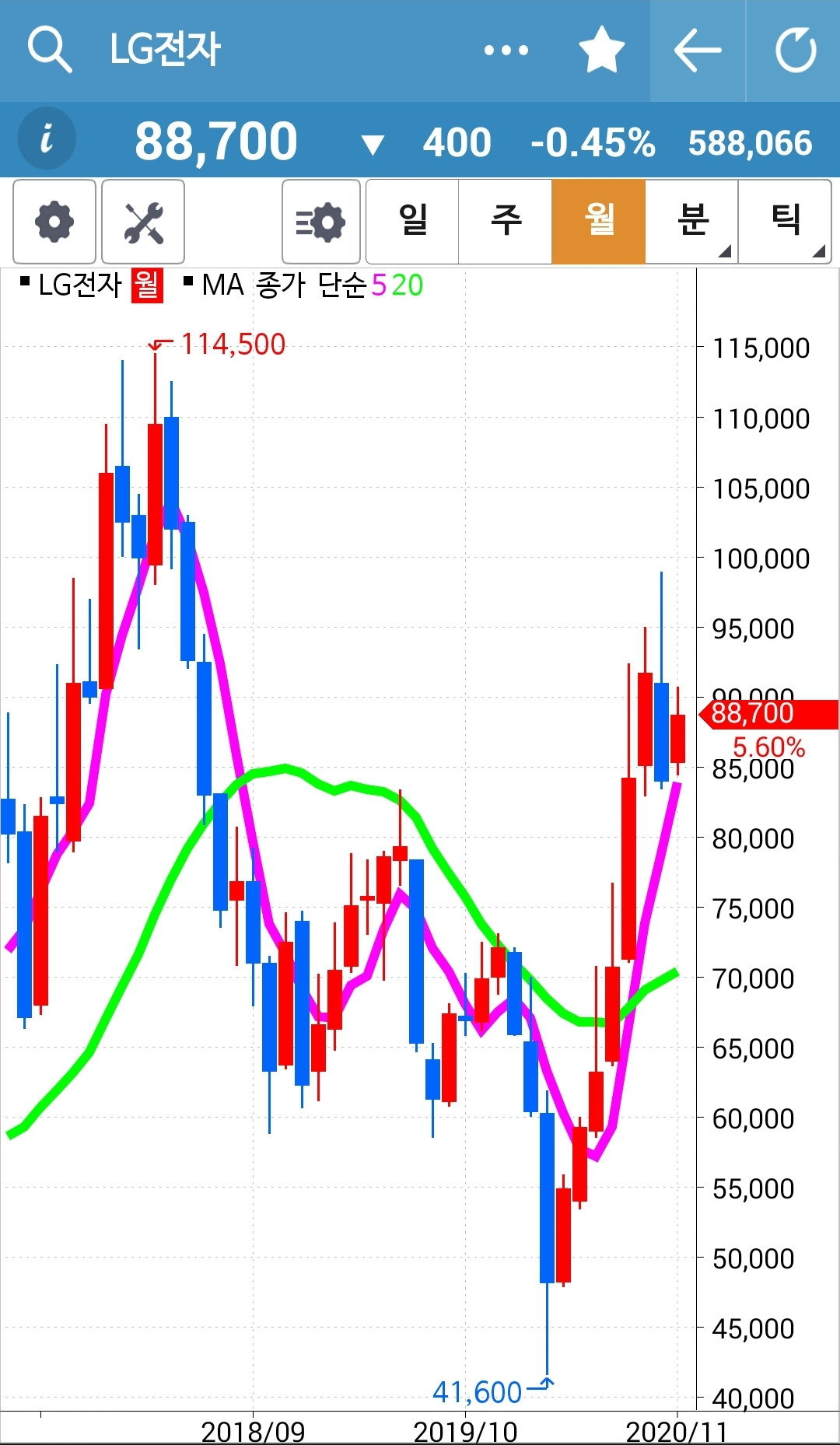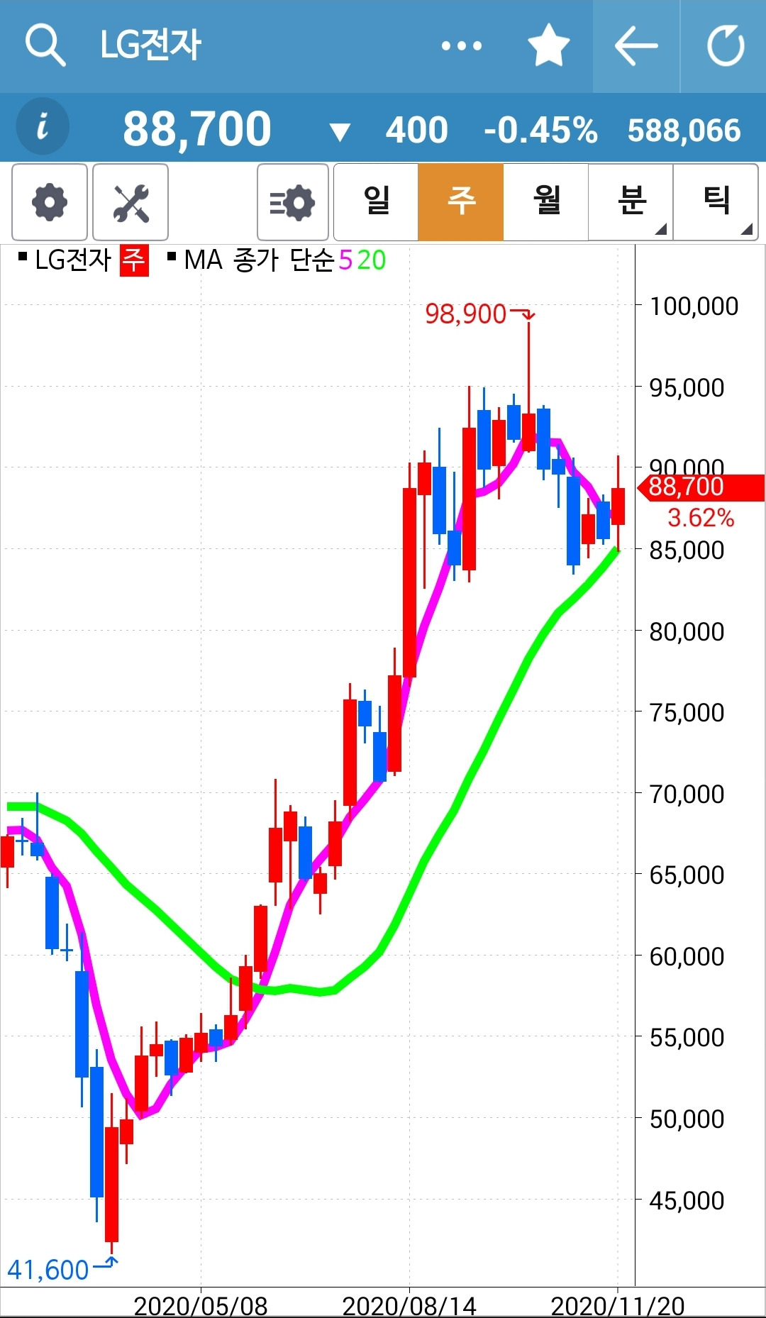 나의 사랑 LG전자의 일봉 5일선이 20일선 위로 고개를 삐죽 내밀었다. 아, 나의 사람 LG전자. 어쩔까나? 서둘러 주식선물 계좌를 본다. 손실을 보아 딸랑 150만 원 남았던 그곳. 오늘 350여만 원을 채워 넣어 새롭게 시작한다. 큰 각오가 아니라 문득 LG전자의 일봉이 삐죽 솟아오르는 걸 보고 정신없이 내린 결정이요 또 정신없이 몽땅 사넣은 것이다. 몽땅 순식간에 사넣는 버릇은 어쩌지 못하는가 보다. 이제 다시 나의 노래를 불러본다. 난 아무것도 몰라요 5일선이 20일선 위로 올라가면 매수할 뿐야요~ 하하 이제 기다리다 난 아무것도 몰라요 5일선이 20일선 아래로 내려가면 매도할 뿐야요~ 만 하면 된다. 파이팅