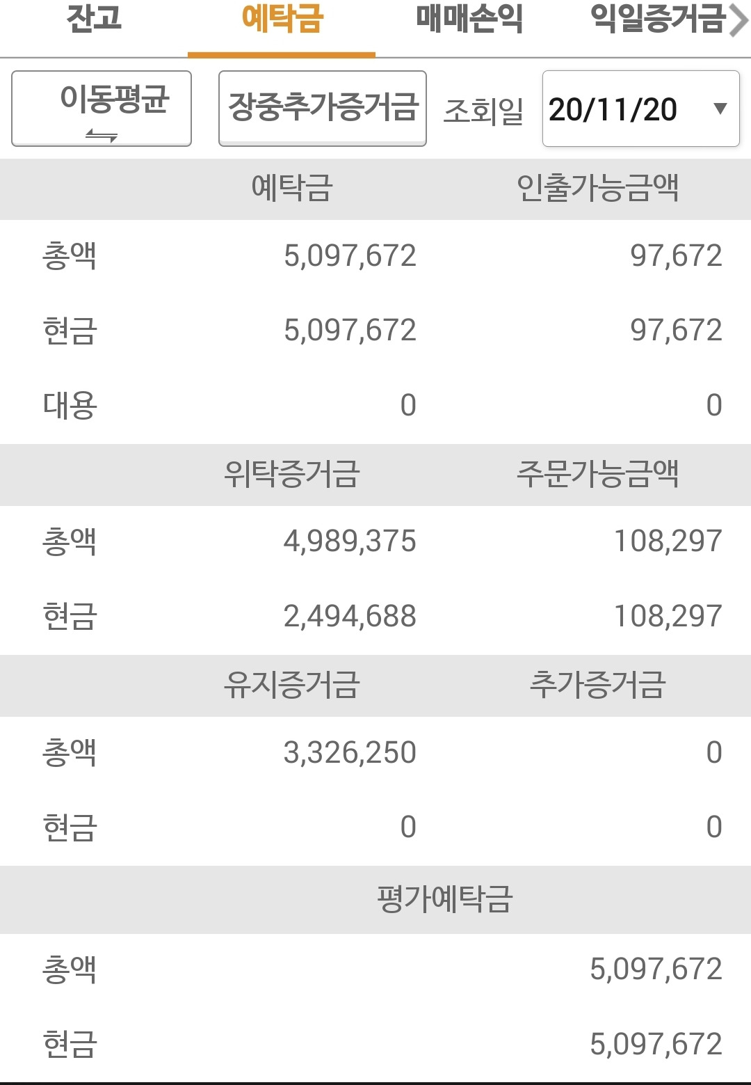 사진 3. 딱 맞추지 못해 7만 원 수익인데 총액 509만어쩌구로 보이는 주식선물계좌 예탁금 현황. 주식선물은 계산이 요상해서 요걸 봐야 내가 수익인지 손실인지 알 수 있다.