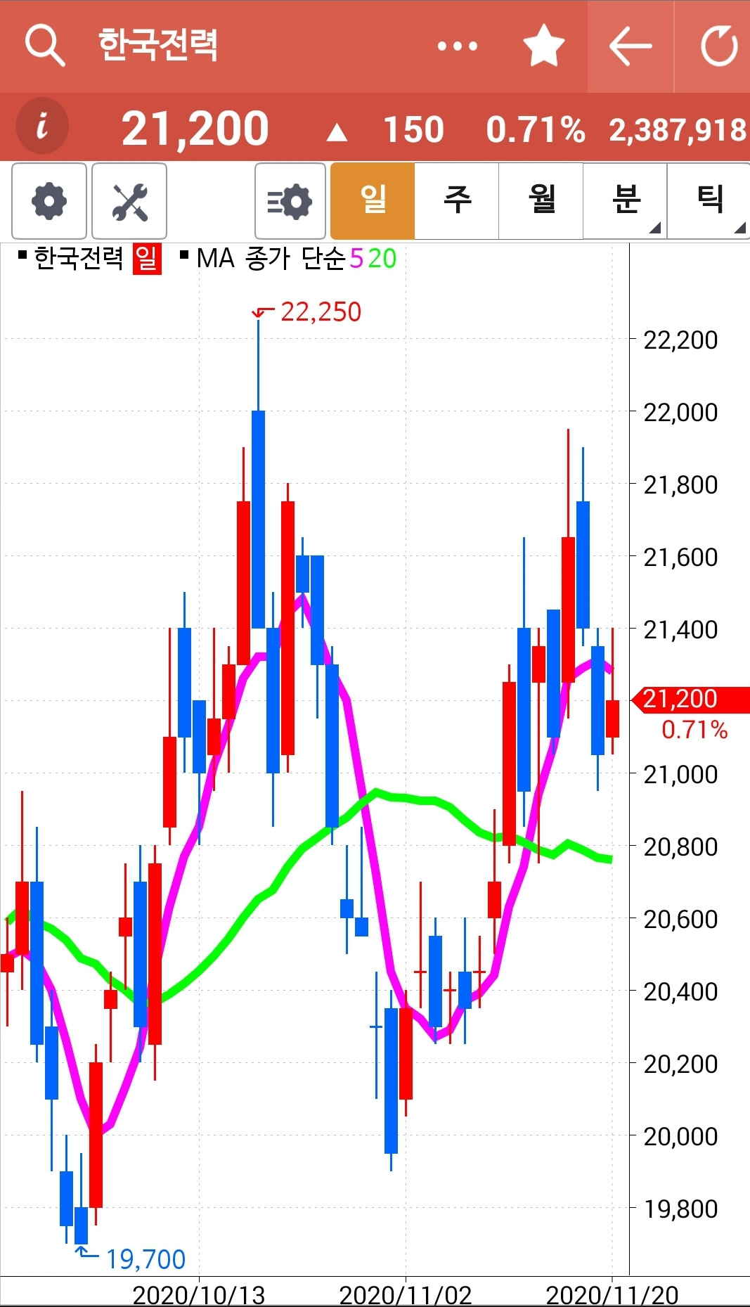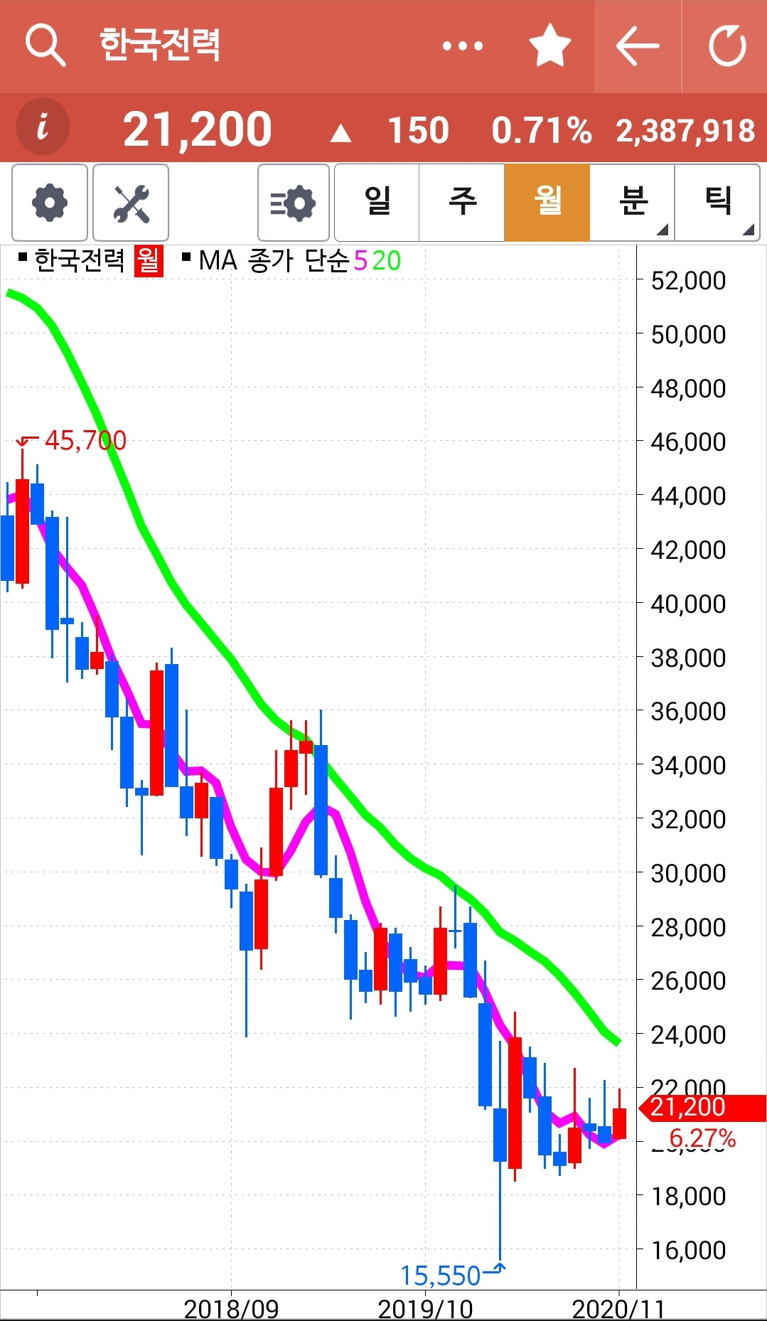한국전력. 나의 손꾸락이 먼저 나가 준 것에 대해 보답이라도 하려는 듯 양봉을 나오게 하려 애는 썼으나 만족할 만한 상승은 아니다. 그래도 하락이 멈췄다는 데 의의가 크다. 주봉의 5주 선도 20 주선 위에 있고 월봉은 과다 하락이고. 그래 자 지켜보자. 이러나저러나 5일선이 20일선 아래로 뚫고 내려간다면 어김없다 탈락이다. 그 이전엔 내 너를 따뜻이 품으리. 파이팅.