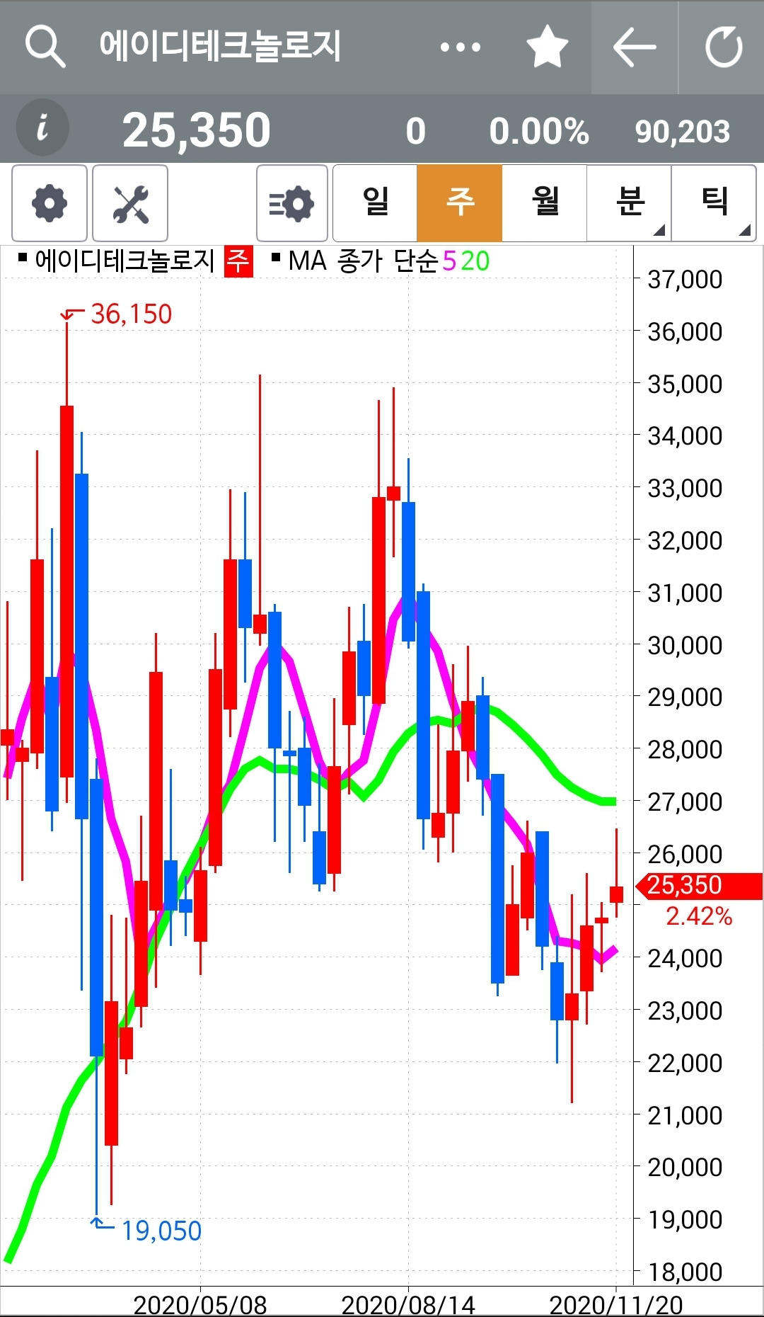 잘 모르겠는 맘에 안 드는 종목이다. 그래도 일단 진입한 거. 뚜렷한 이유가 없는데 팍 내치는 것을 못하고 있다. 게다가 주봉 5 주선이 20 주선 밑에 있다는 것이 영 마음에 걸린다. 그래도 월봉의 5개월선이 20개월 선 위에 있다는 것에 약간 안심을 한다. 아무리 주봉 월봉에서 좋은 면을 보인다 해도 내가 주력을 두는 것은 일봉. 5일선이 20일선 아래로 내려가면 얄짤없다. 무조건 탈락이다. 흥 그러니 정신 차리고 어서어서 높이높이 올라가거라.