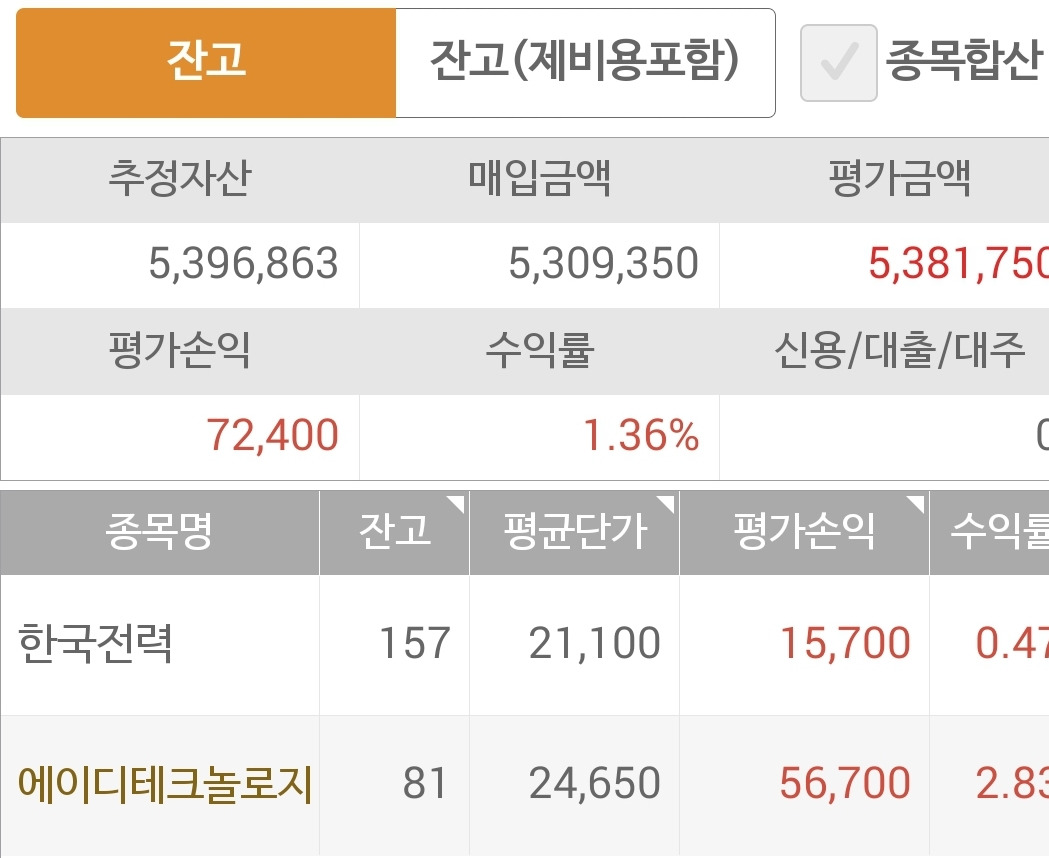 사진 1. 현물 주식. 총 오백만 원 투자에서 39만 원 수익중.