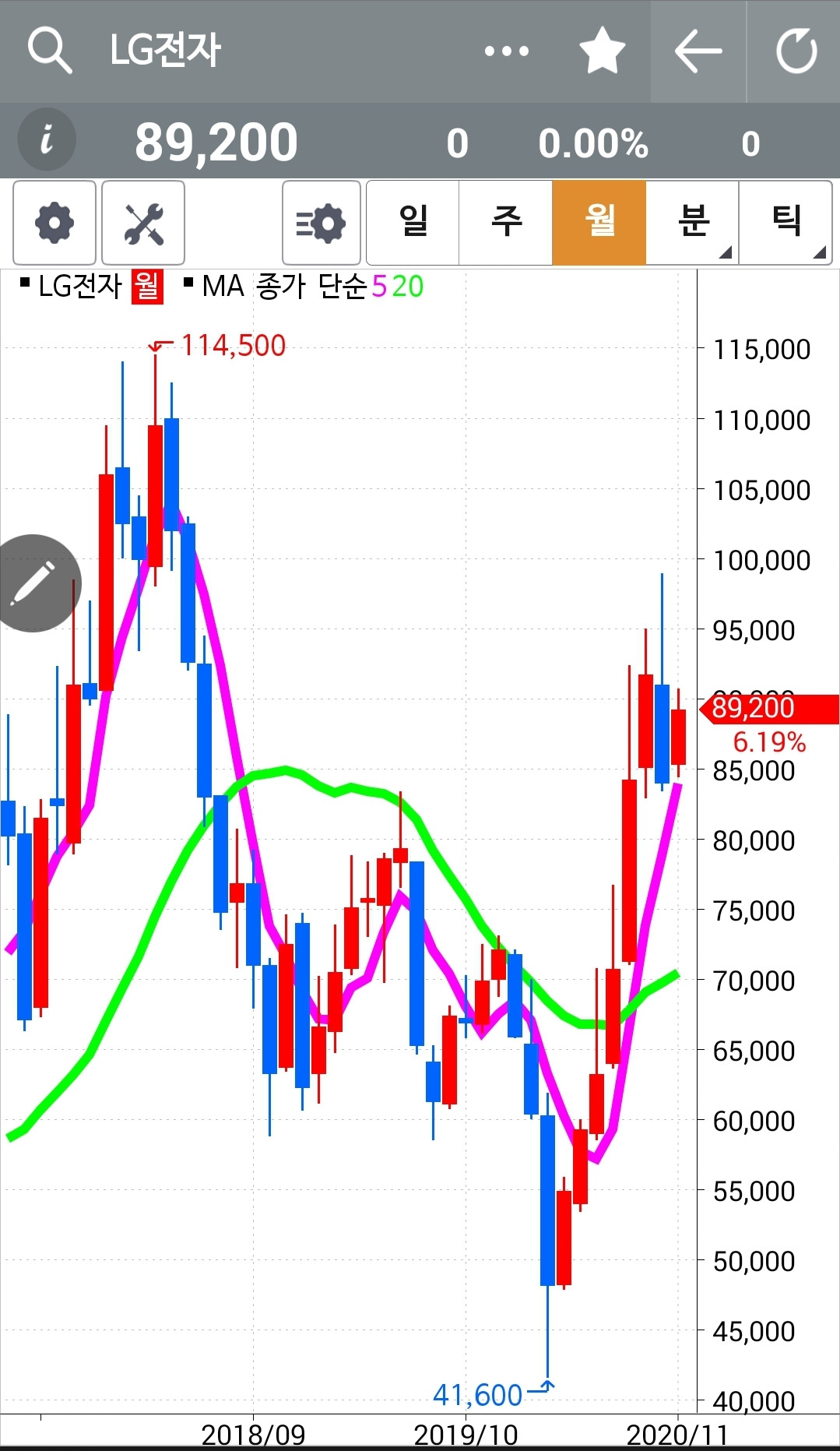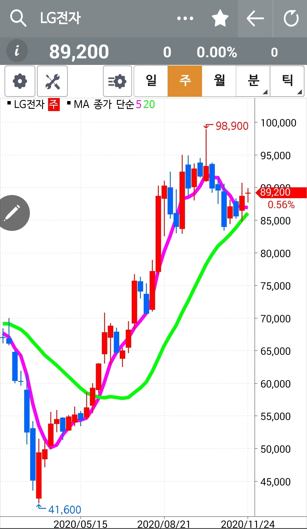 LG전자. 나의 사랑 엘지전자. 이역시 빵 멋지게 올라주지 못하고 5일선이 20일선을 뚫은 후 숨 고르기 하는 모습이다. 웅크렸다가 깡총이 아니라 껑충 높이 뛰어버릴 모습을 상상해본다. 그럼 그럼. 상상은 나의 몫. 난 아무것도 몰라요 5일선이 20일선 아래로 내려가면 매도할 뿐야요~ 를 지키는 한 망상은 바다라 했던가 나의 상상도 바다처럼 끝이 없으리. 푸하하하. 오늘도 파이팅!