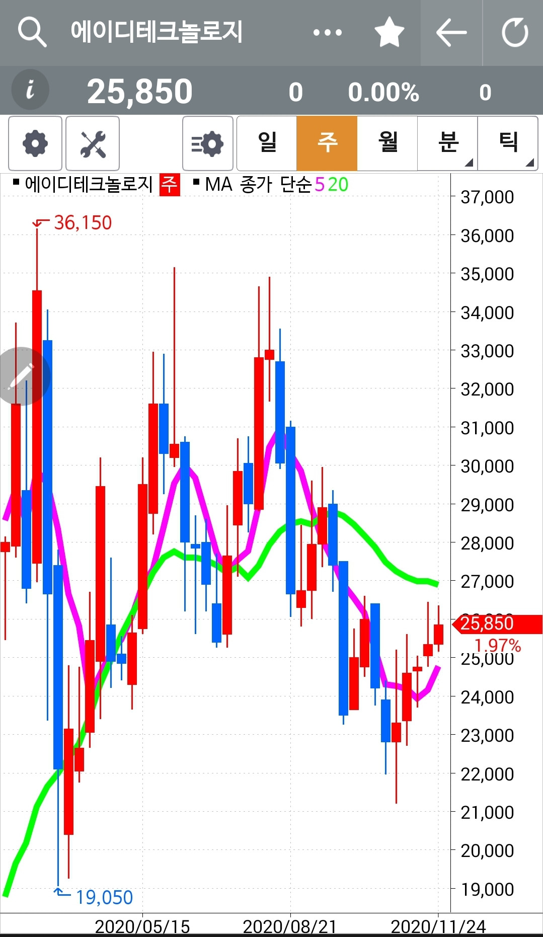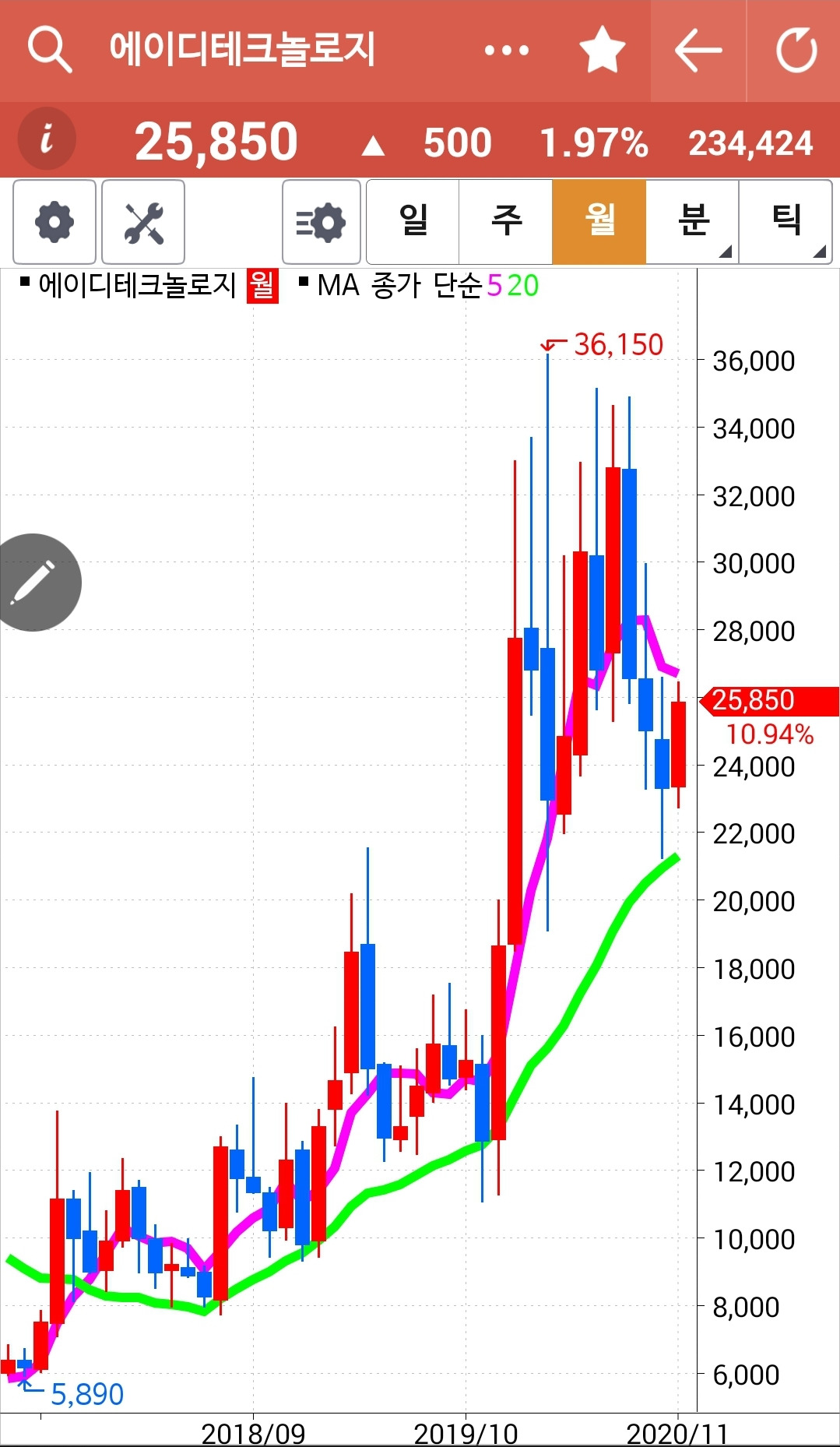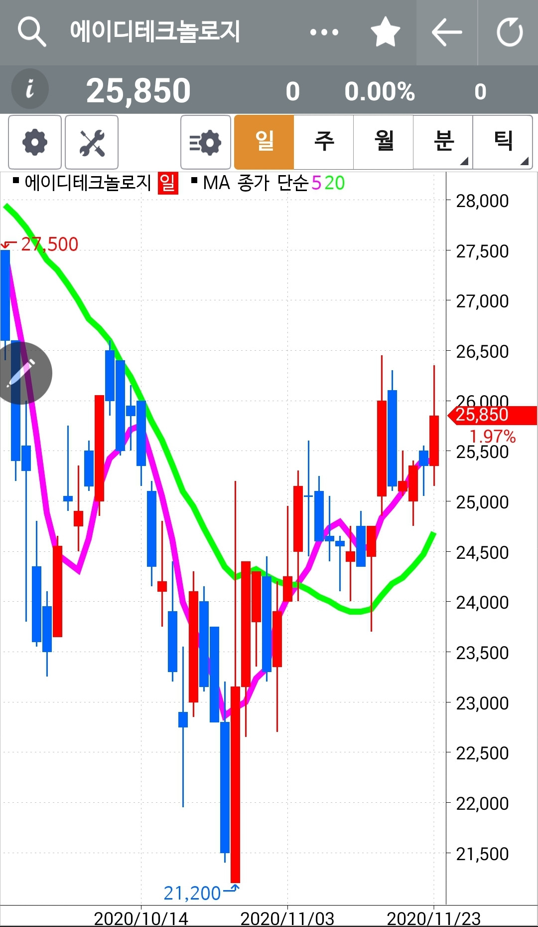 에이디테크놀로지. 빵 빵빵 신나게 올라가지는 못하고 전 고점 근처에서 밀렸다. 그림대로라면 전 고점을 가볍게 뚫고 조정받은 폭만큼 깡총 올라주는 게 맞는데. 어서어서 힘차게 올라가거라. 파이팅.