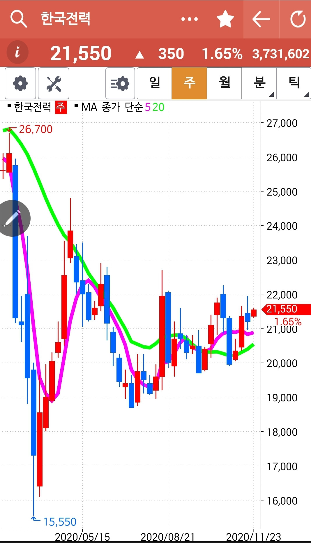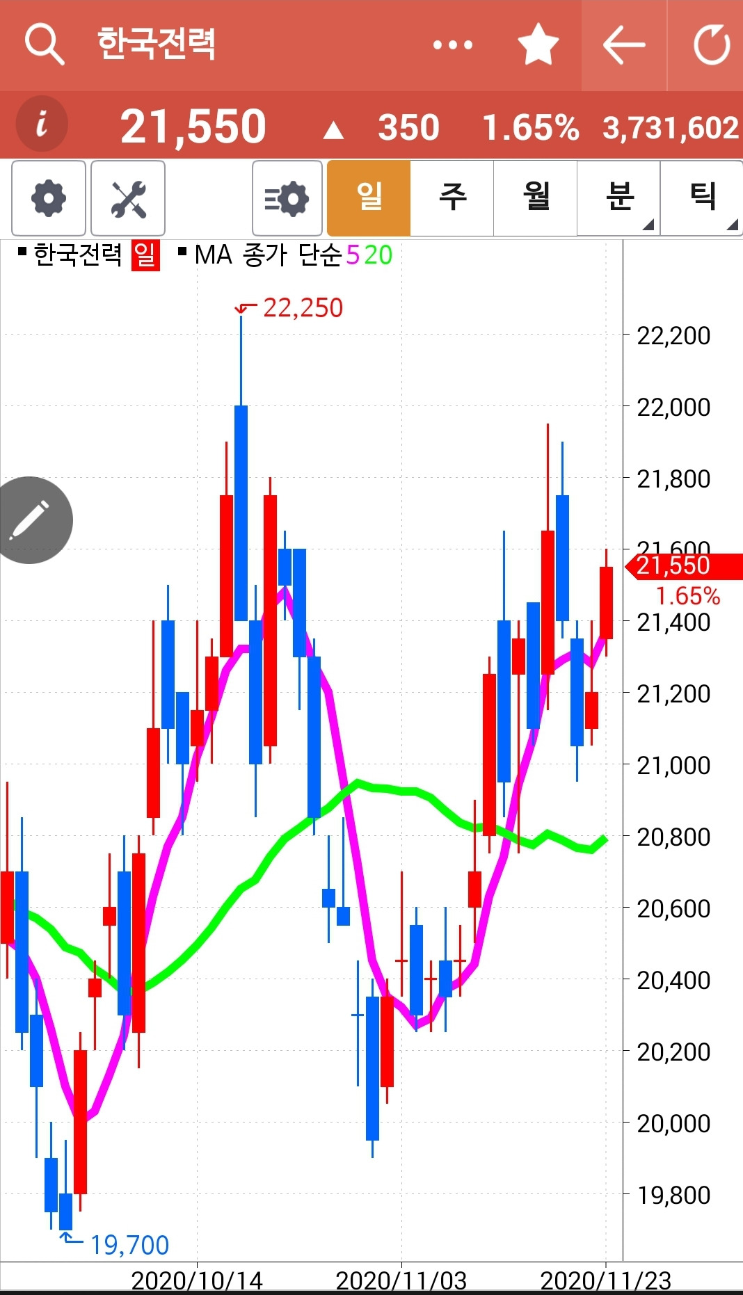 역시 5일선이 20일선을 빵 뚫고 난 후의 조정에선 사들어가는 게 맞는 것 같다. 철저히 5일선이 20일선 아래로 내려가면 딱 끊고야 말겠다는 각오와 함께 말이다. 손이 근질근질하게 들어간 한전은 그렇게 잘 올라주었다. 하긴 모든 주식이 저렇게 시뻘겋게 올라가는 중에 안 올라가기가 더 어려웠으리라. 하하