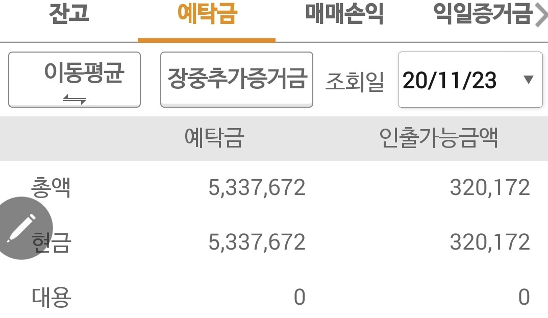 사진 3. 선물주식 수익 현황. 예탁금을 보면 얼마를 벌고 있는지 알 수 있다. 오백만 원 투자에 33만 원 정도의 수익 중이다. 잘해보자. 수익 챙기기를 잘해야 한다. 파이팅!
