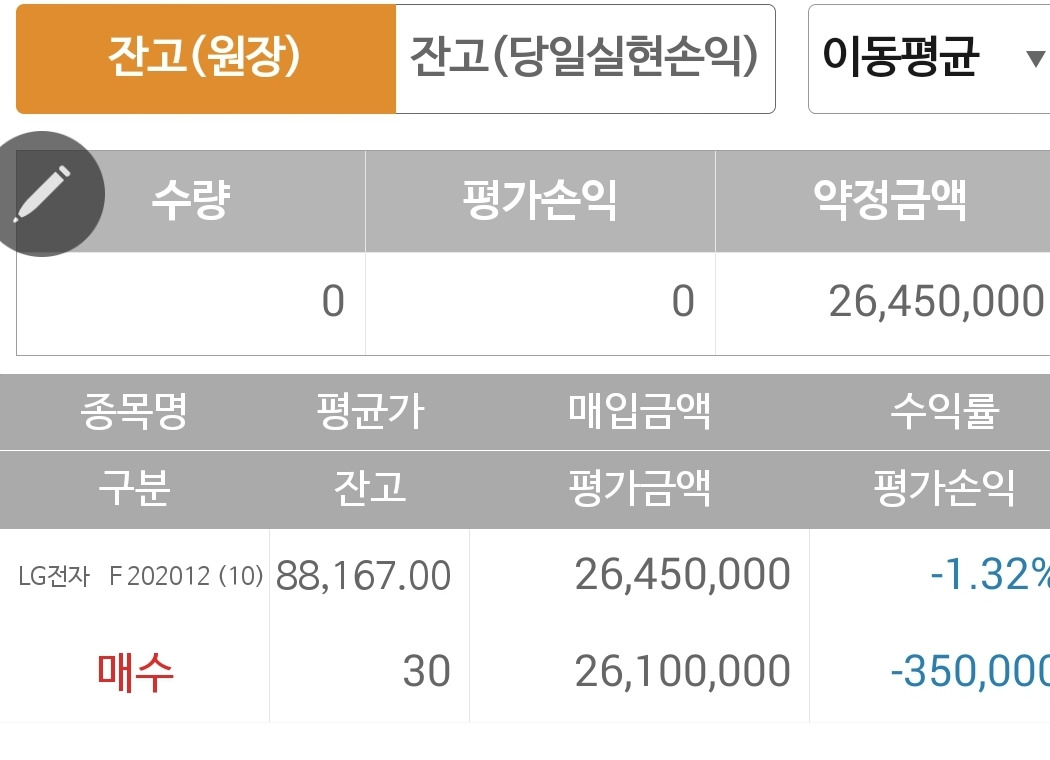 사진 2. 선물주식. 총 오백만 원 투자에 35만 원 손실 중. 아, 난 왜 LG 사랑에 빠졌을꼬.