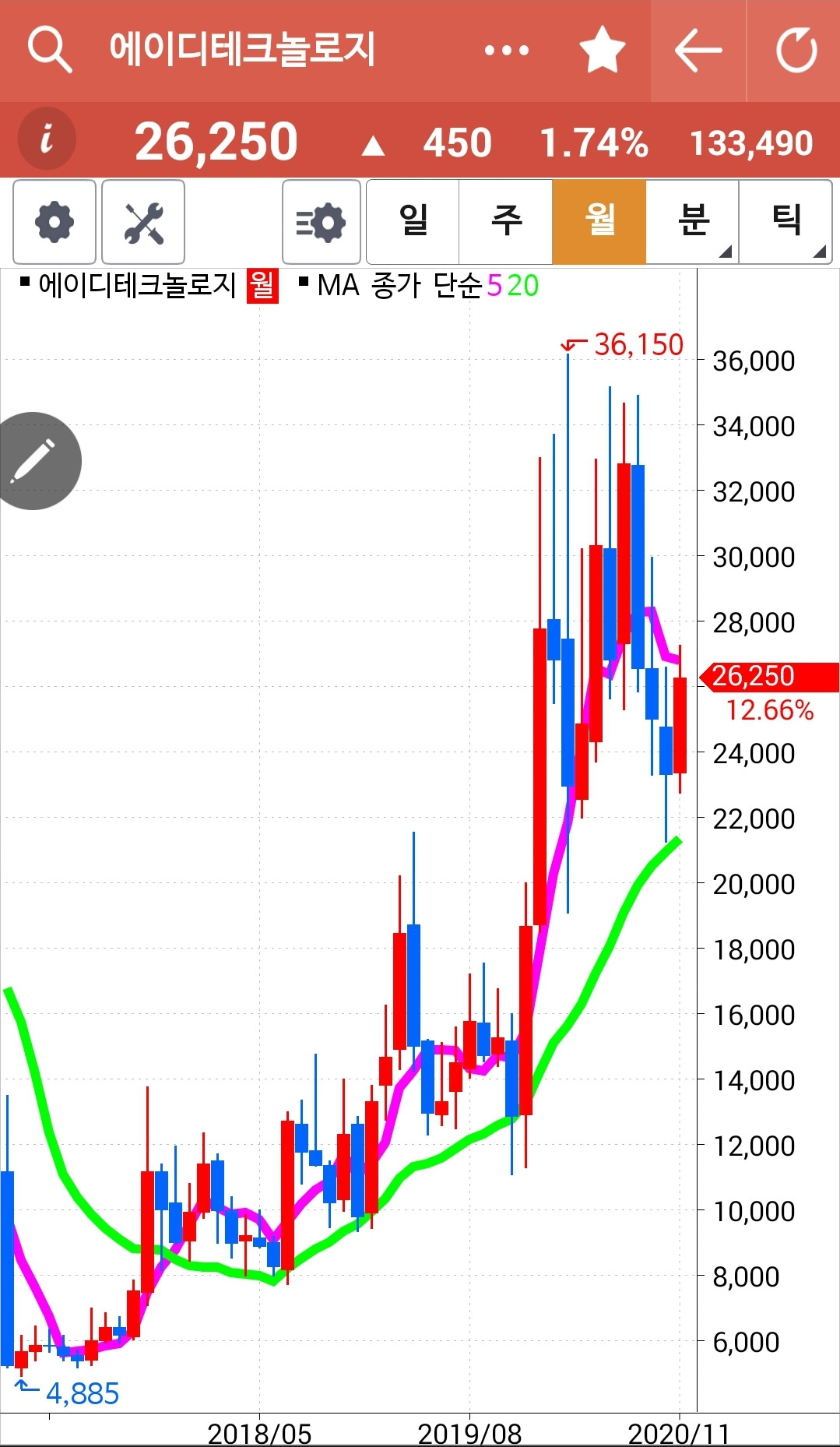 에이디테크놀로지. 5일 선 따라 양봉 나오다 음봉 나오다 하면서 찬찬히 잘 올라가고 있다. 이 역시 5일선이 20일선 위에 있으므로 탈락시킬 필요가 없다. 파이팅.