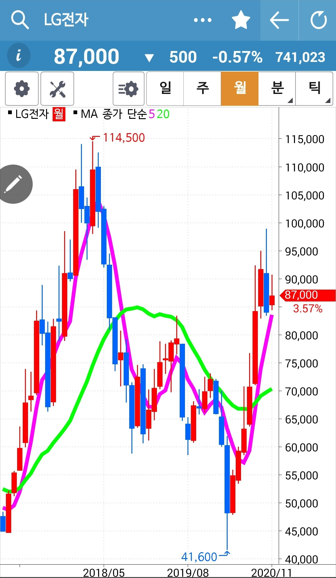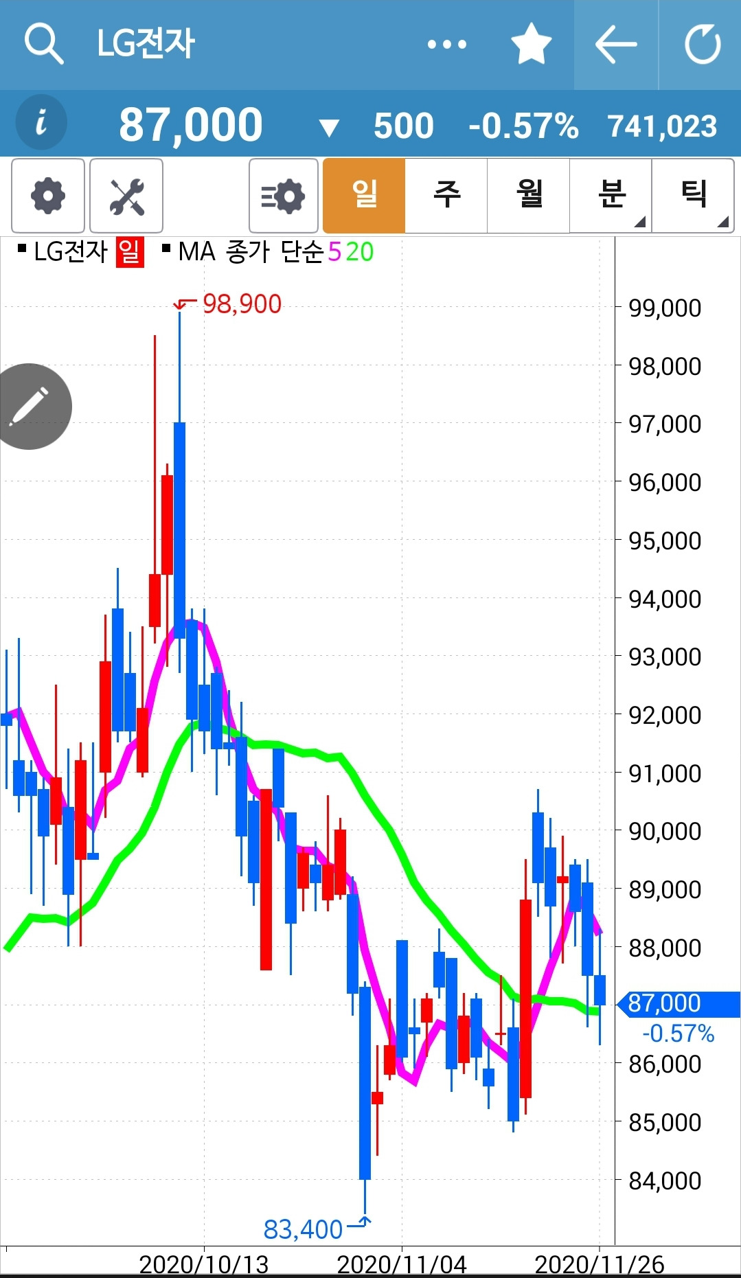 LG전자. 언니 왜 LG전자를 사랑해요? 삼성전자를 사랑하세요. 그렇게 말하는 동생은 삼성전자를 사서 수익을 꽤 냈다고 자랑한다. 그러게. 난 왜 초지일관 LG전자 사랑 일꼬. 할 수 없다. 5일선이 그러나 아직 20일선 위에 있으므로 매수 유지다.