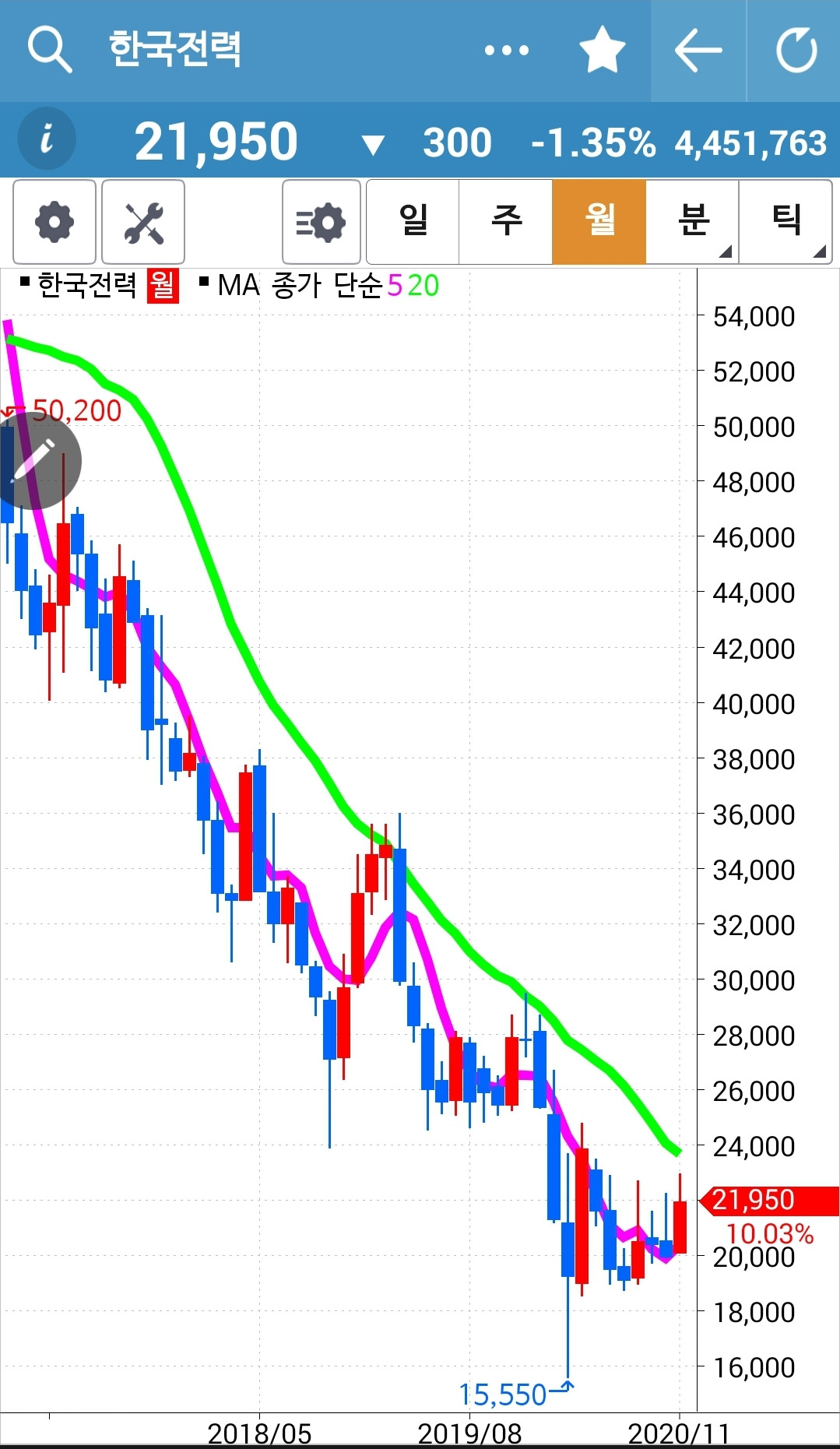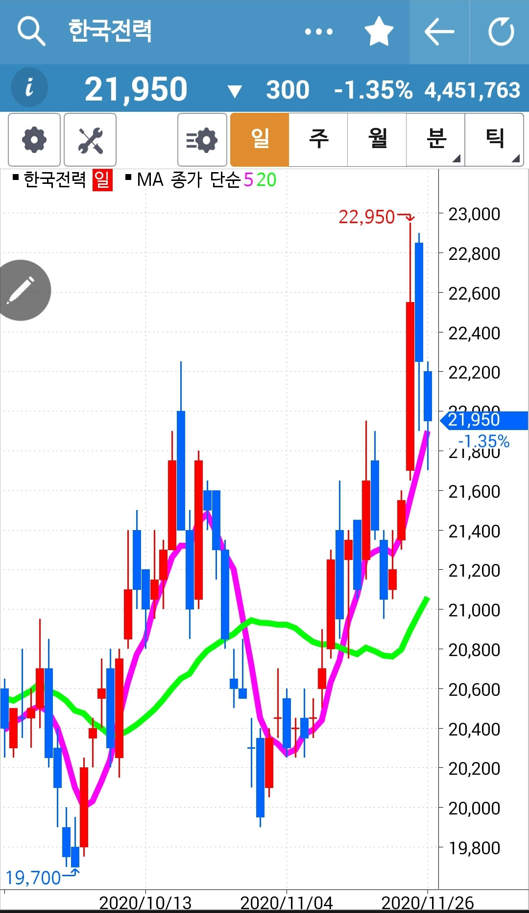 한국전력. 5일선이 20일선 위로 올라와 매수했고 빵빵 잘 올라가던 것이 이틀째 대거 하락 중이다. 그래도 그림은 올라가는 모습이니 잘 지켜보자. 5일선이 20일선 위에 있을 땐 여유만만. 꽝 충돌이 일어날 듯싶을 때만 긴장하면 된다. 파이팅.