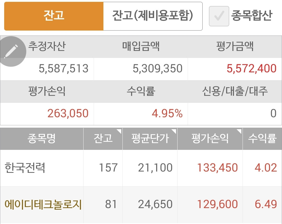 사진 1. 현물 주식. 총 오백만 원 투자에 58만 원의 수익중.
