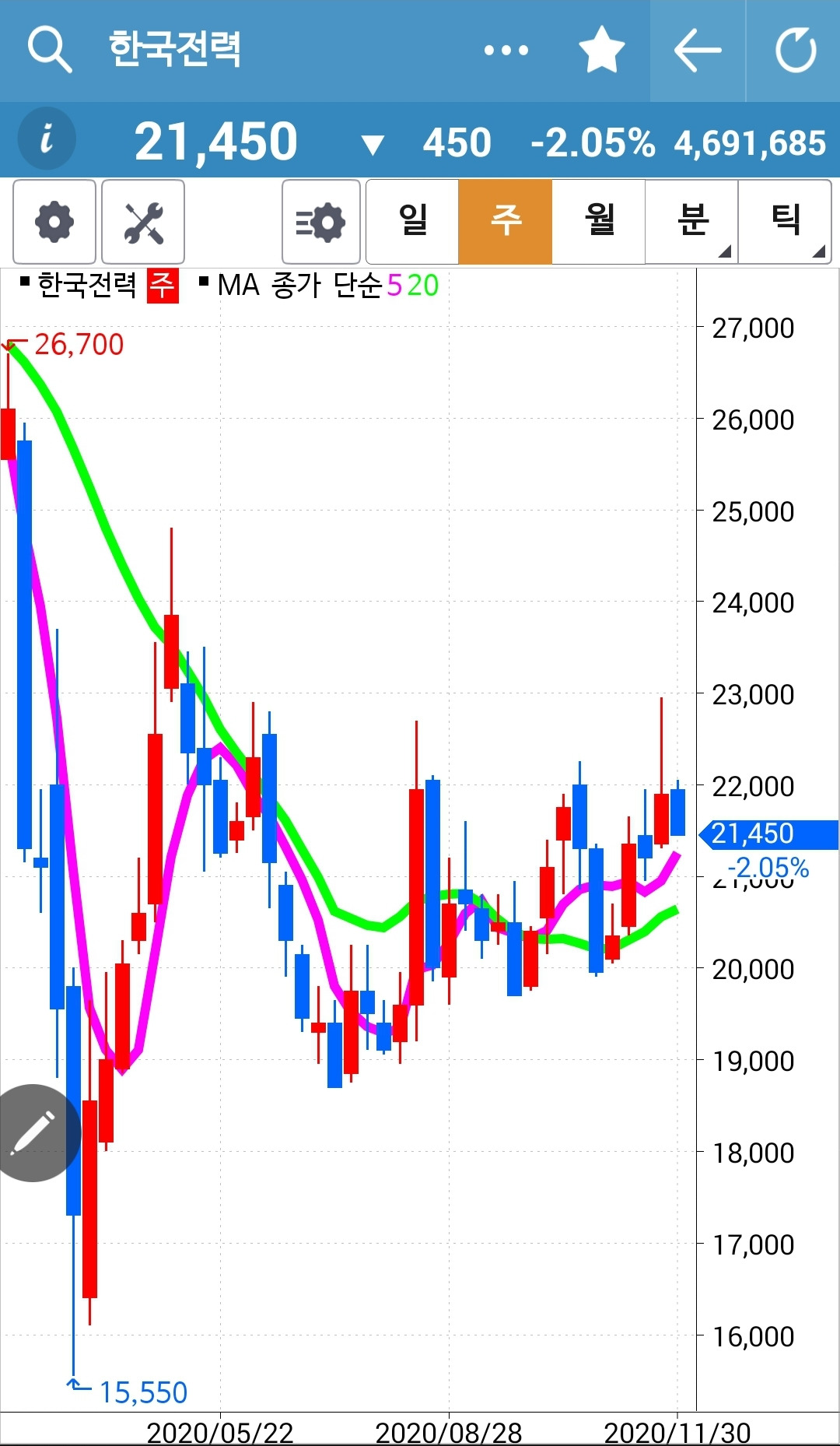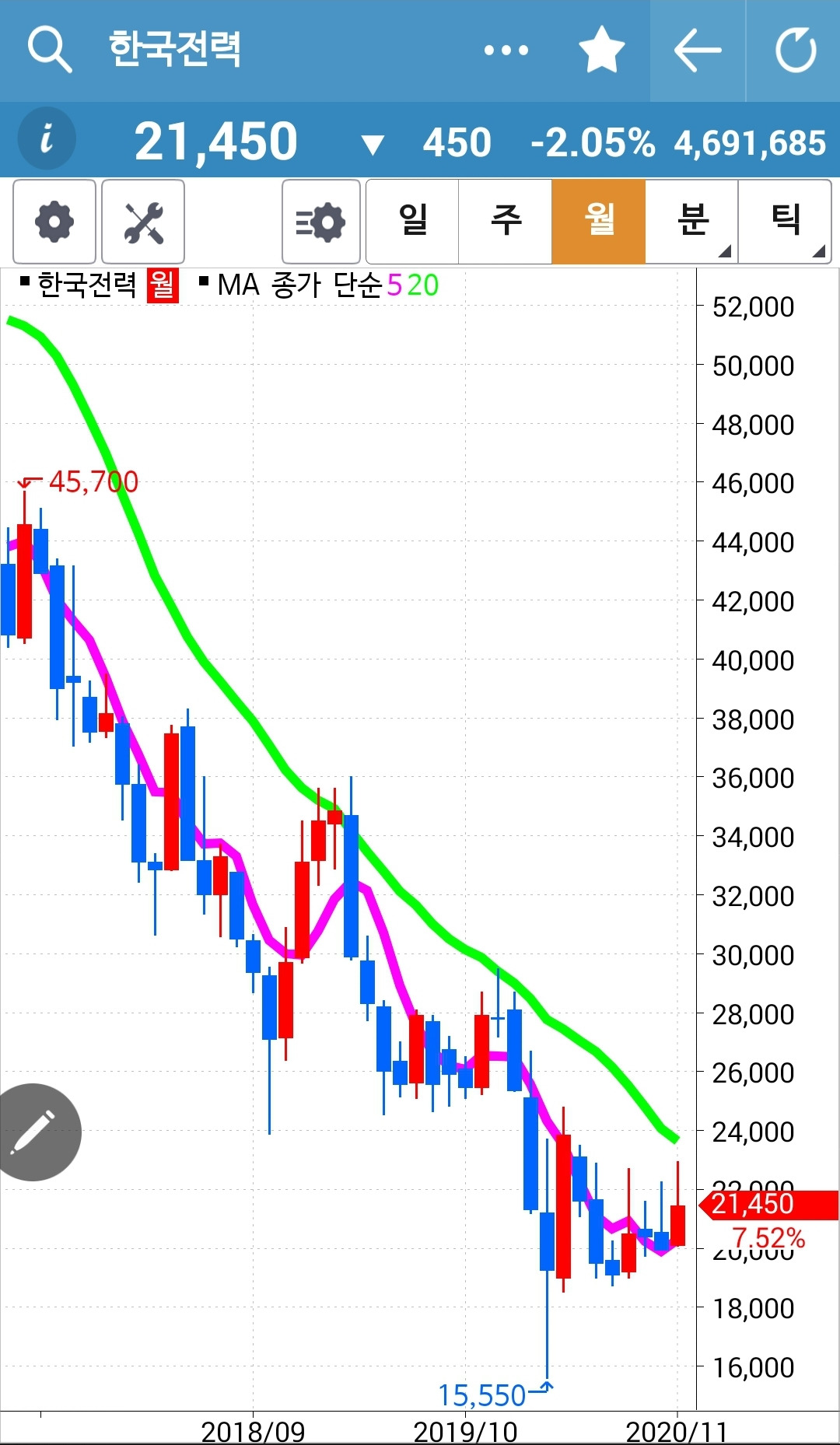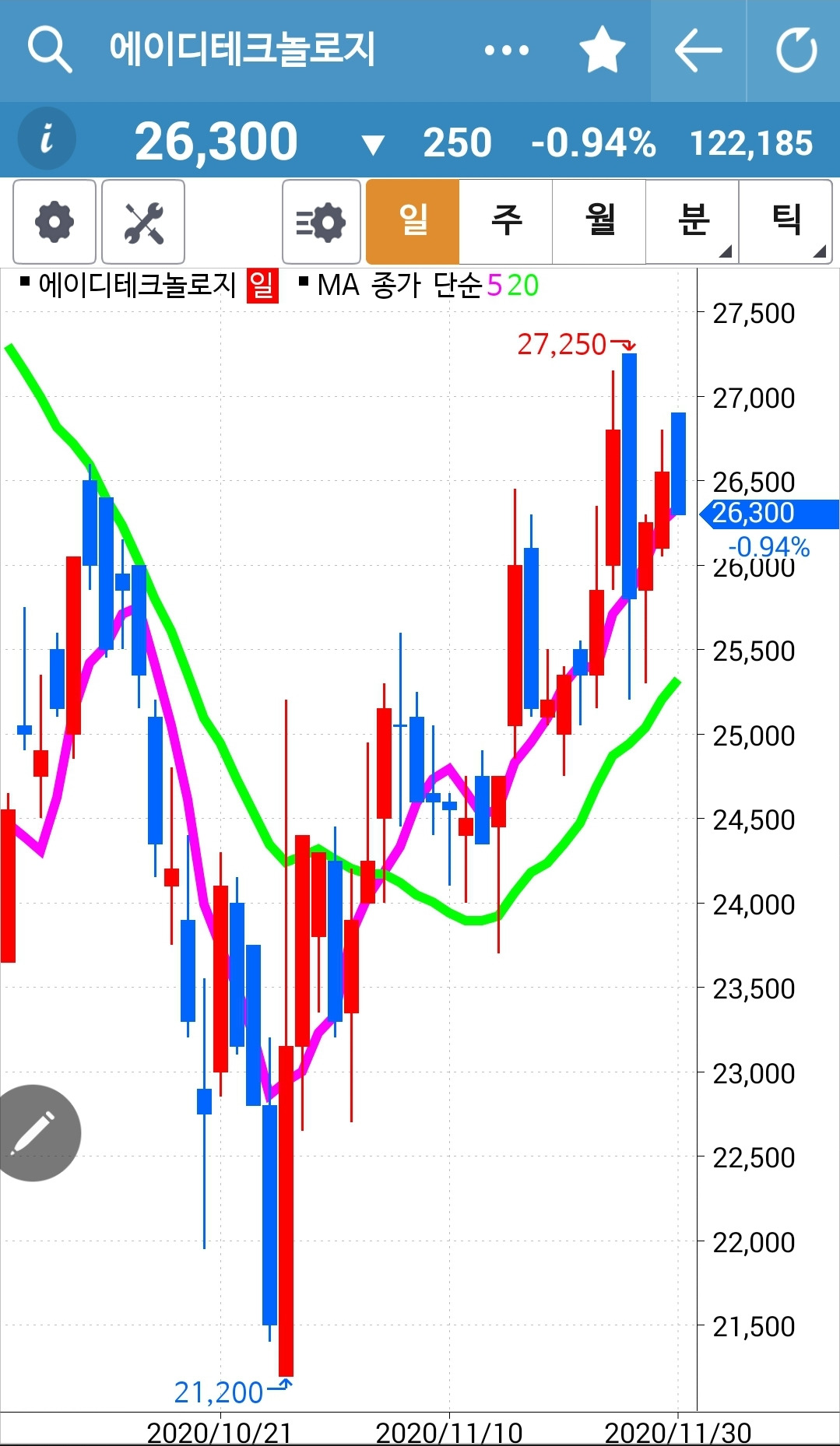 이렇게 떨어지기까지 가만히 있어야만 하는 걸까? 그렇다. 나의 원칙은 그렇다. 5일선이 20일선 위에 있는 한 움직이지 않는다. 어디서 나왔어야 할까. 내가 지키려는 원칙은 단 하나이기에 다른 방법은 생각하지 않는다. 그래 연말까지는 그냥 난 요것만 한다. 난 아무것도 몰라요 5일선이 20일선 아래로 내려갈 때 매도할 뿐야요~ 그래 그것만 하리라.