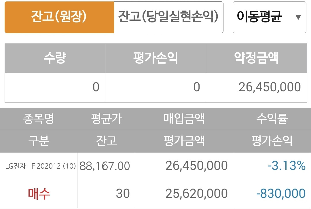 사진 2. 선물 주식. 83만 원의 손실 중.