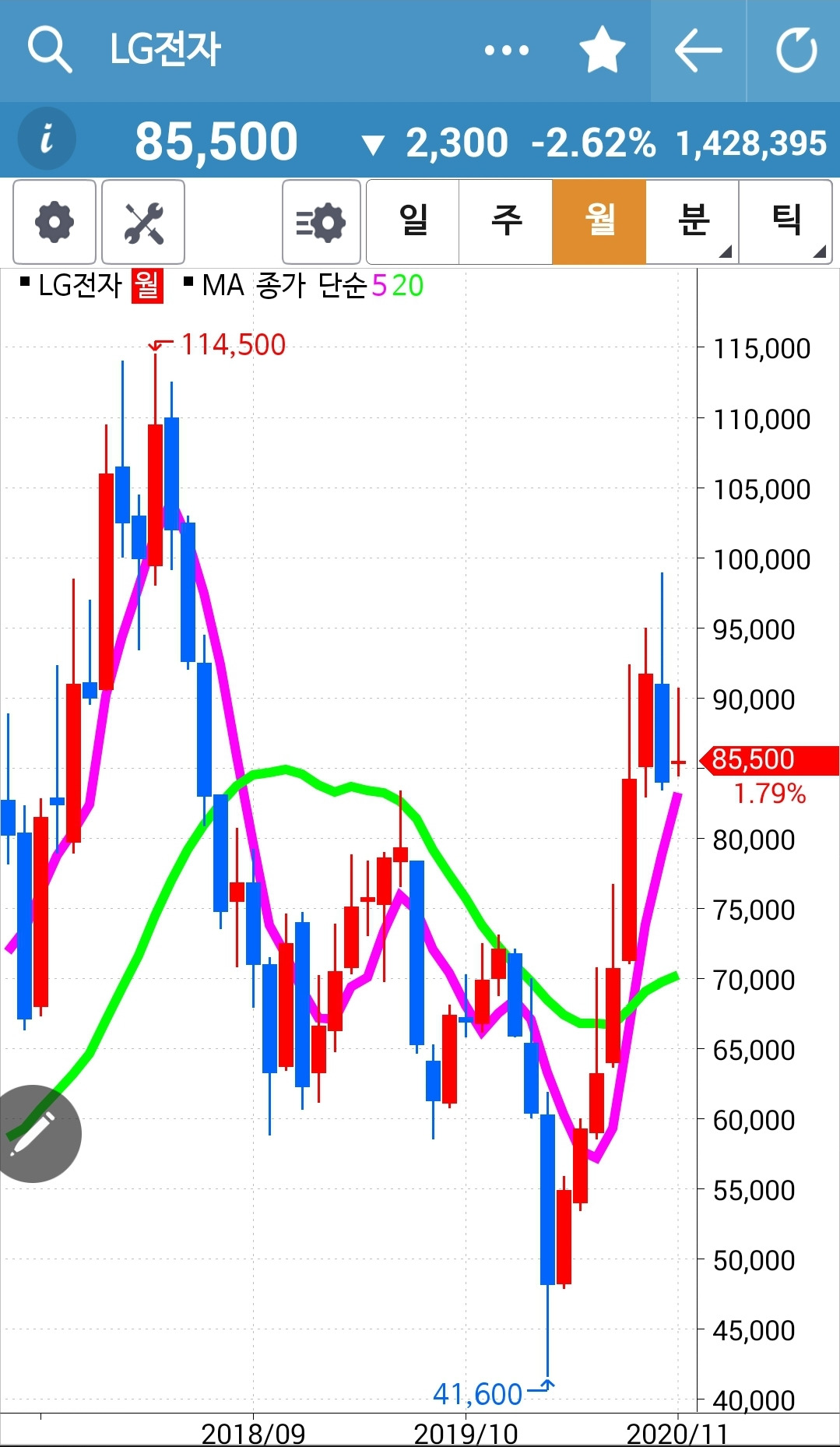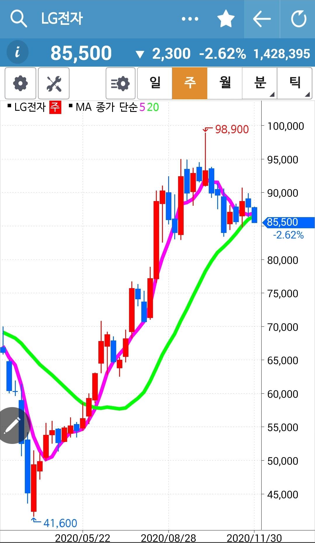 아, 나의 사랑 LG전자 꼴이 말이 아니다. 오늘의 긴 장대 음봉에 가려져 5일선이 20일선을 뚫고 내려갔는지도 모르겠다. 어떻게 계산하면 나오겠지만 그 또한 귀차니스트인 내겐 버거워 그냥 둔다. 내일 그림이 확실하게 내려간 것으로 보이면 그때 매도하리라. 이제 다신 LG전자 나의 사랑이라고 하지 않으리. 5일선이 20일선을 뚫고 내려간 것이 확인되는 순간 내 칼같이 내치리라. 흥.