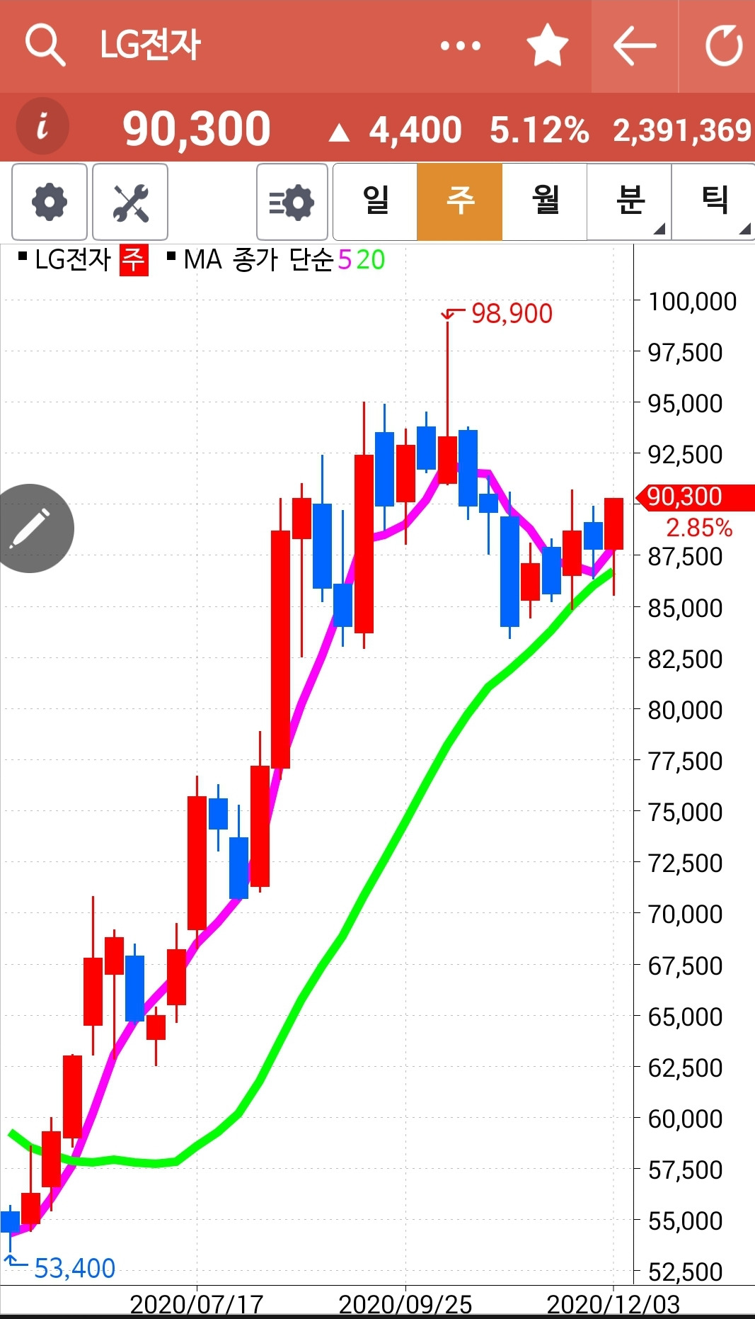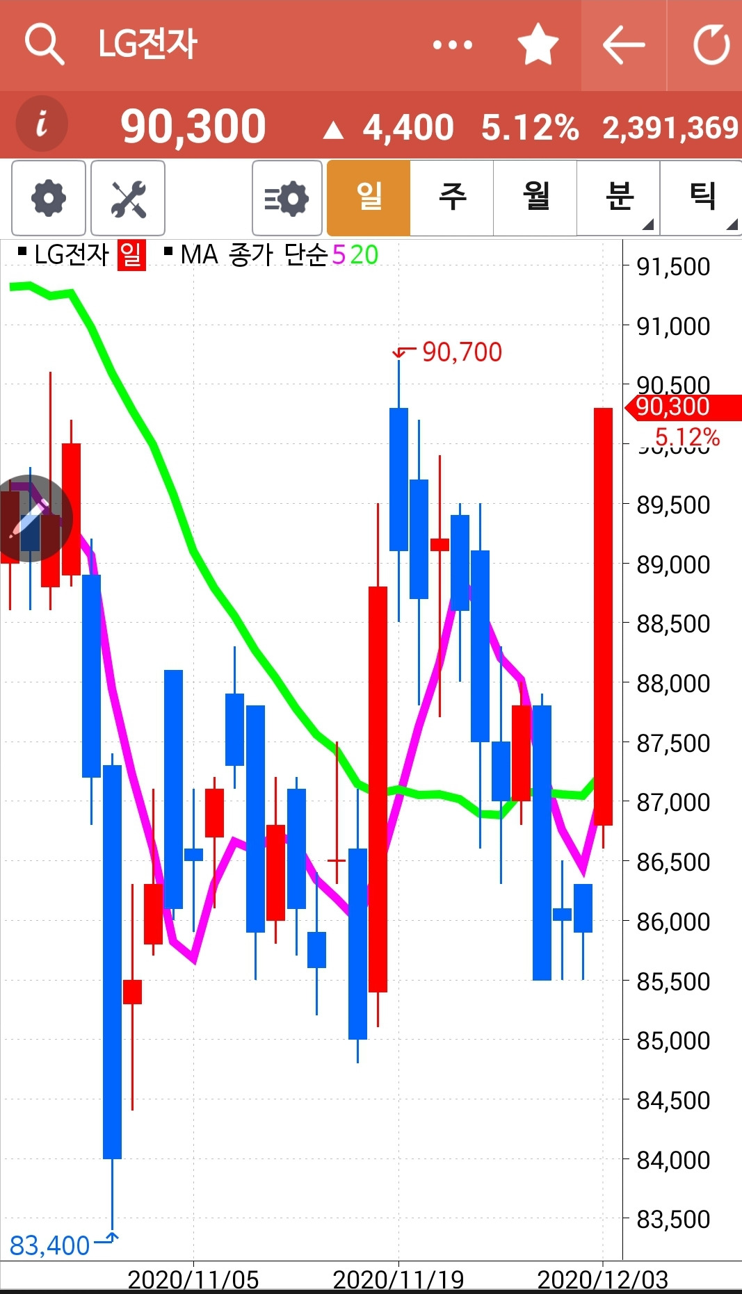 이럴 수가! 배신을 때려도 유분수지. 하. 5일선이 20일선을 뚫고 내려가기에 놔라! 가차 없이 탈락시켰더니 오늘 보라는 듯 빵! 무려 5프로나 올랐다. 이럴 수가. 그동안 비실비실 내려가던 걸 단숨에 극복해버렸다. LG전자. 나의 사랑이었던 LG전자. 그럴 수 있는가!