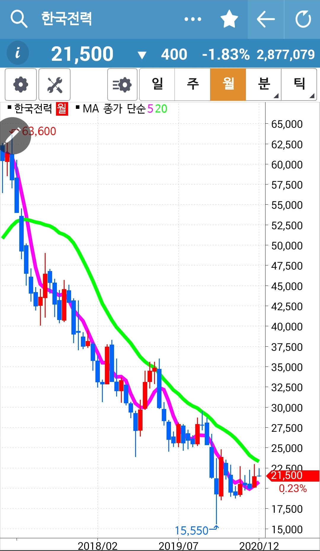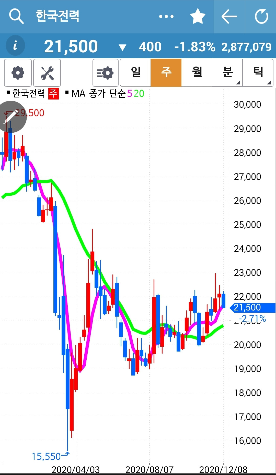 한국전력. 긴 음봉을 그리며 20일선을 뚫고 내려왔다. 그러나 아직 5일선이 20일선 위에 있으니 지켜보기로 하자. 이대로 내려가려나? 전고점을 못 뚫고 전 저점을 뚫고 내려간다면 좀 희망이 없을 것도 같다. 그래. 두 눈을 동그랗게 뜨고 지켜보자.
