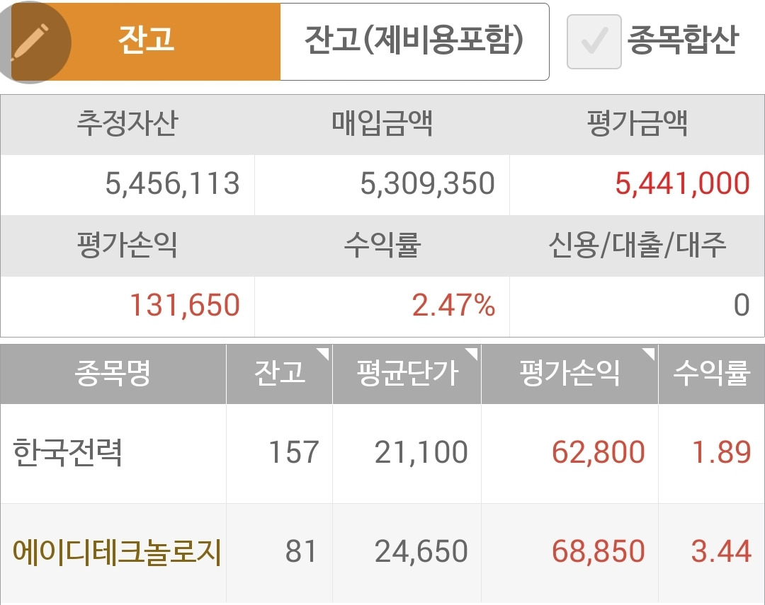 사진 1. 현물 주식. 오늘 거의 모든 주식은 시퍼런 음봉을 기록하며 내려갔다. 나의 주식도 마찬가지다. 수익은 점점 줄어 45만 원이다.