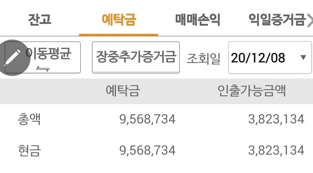 사진 3. 선물 주식 예탁금. 350만 원을 채워 넣어 500만 원을 만들어 새롭게 시작했으니 나의 원금은 850만 원이라 할 수 있다. 그런데 지금 956만 원이니 350만 원의 손실을 모두 만회하고도 백만 원 정도의 수익을 낸 것이다. 오호호호. 물론 내일 어찌 될지 알 수 없으나 요건 선물 주식이기 때문에 내일모레 목요일이 만기이므로 내일부턴 뛰어내릴 자리를 좀 신중하게 볼 필요가 있겠다. 파이팅.