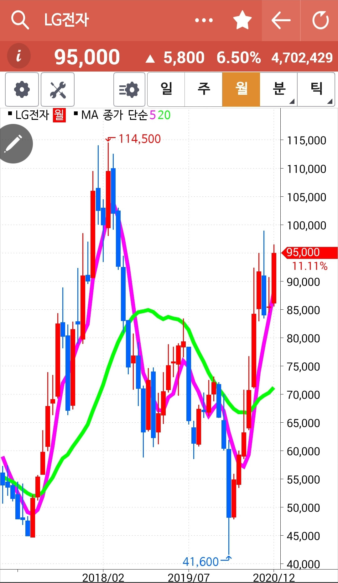 하핫. 요 거이 웬일일까? 어쩜 모두 시퍼러둥둥일 때 어떻게 이렇게 길게 쭉 뻗어나갈 수 있는 걸까. 전 고점 98,900원은 가볍게 뚫고 더 올라가지 않을까? 신나게 지켜볼 일이다. 파이팅!