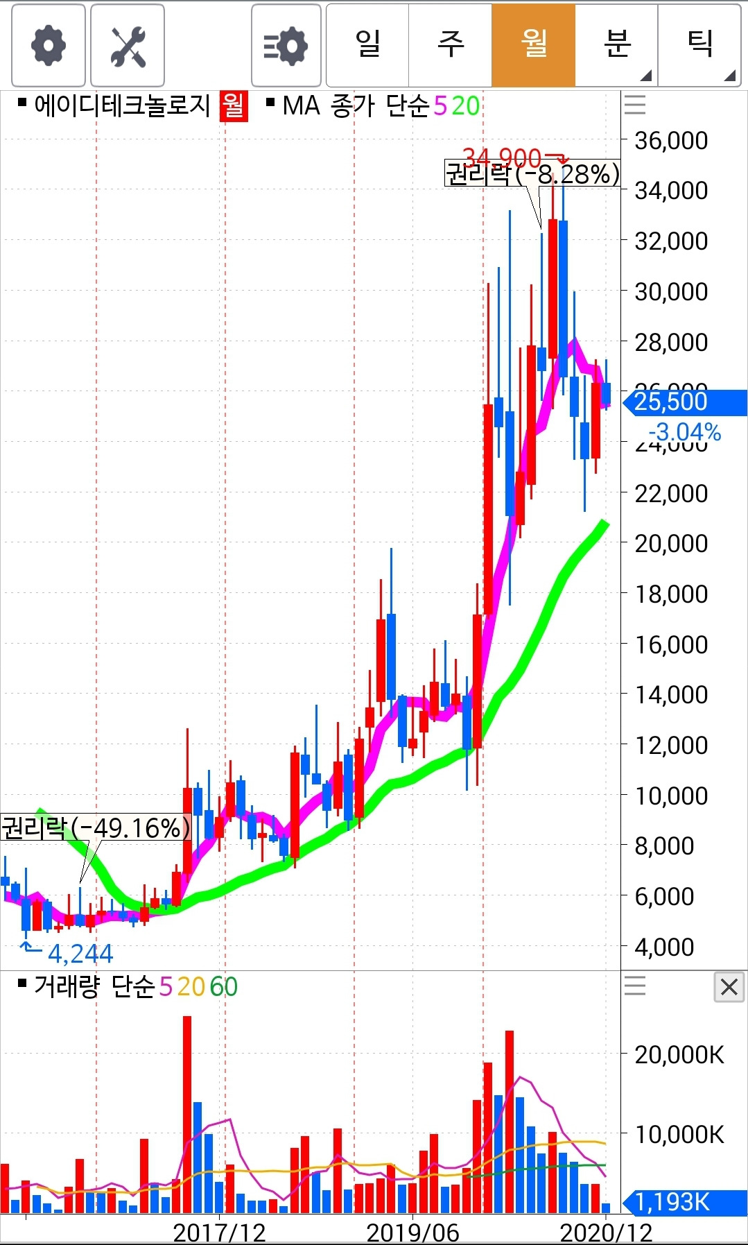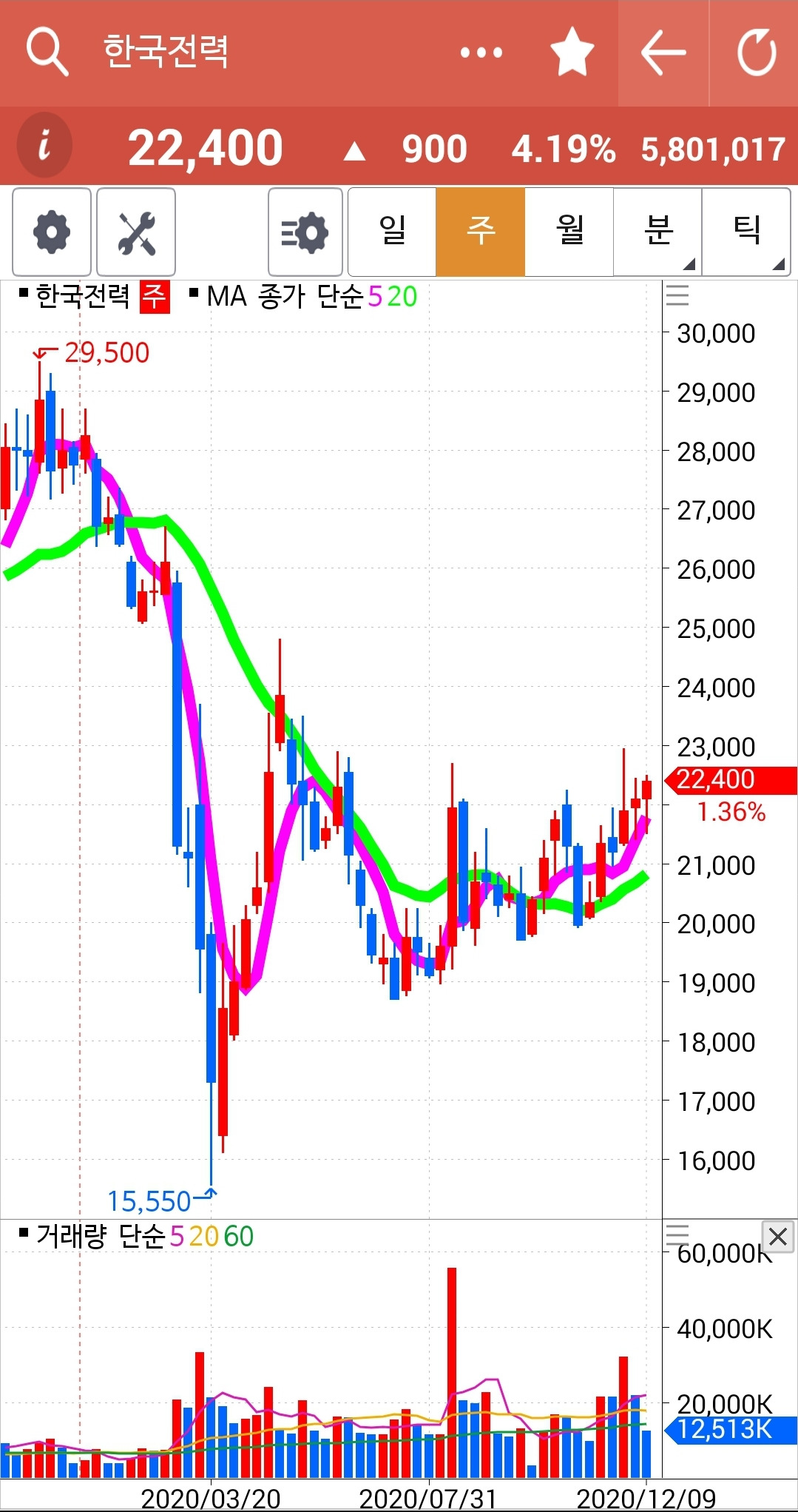 한국전력. 비실비실 대더니 드디어 20일선을 건드리고 위로 빵! 올랐다. 전고점을 가볍게 넘겼으니 전전 고점을 향해 달려갈 것이다. 22,950원은 가볍게 넘기지 않을까 기대해본다. 파이팅.