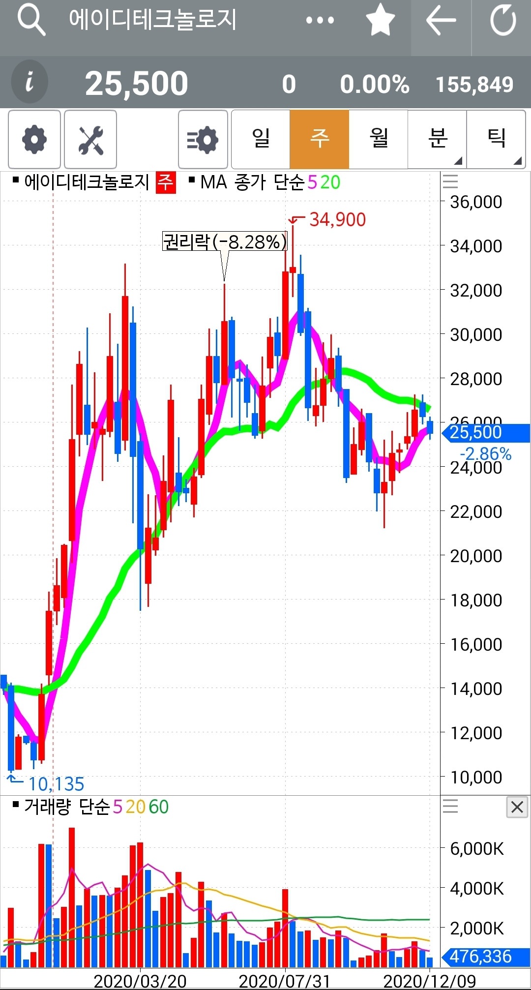 에이디테크놀로지. 20일선을 건드리고도 빵! 올라가지 못하고 비실 비실대고 있다. 오늘내일 5일선은 20일선 아래로 내려올 것이다. 그렇다면 가차 없이 탈락이다. 주식에서 거래량은 매우 중요하다. 그러나 지금까지는 5일선과 20일선에만 집중하기 위해 아예 거래량을 없애버렸었다. 그러나 이제 5일선과 20일선의 충돌에선 즉시 반응하는 것 보니 어느 정도 훈련이 되었다 치고 거래량도 함께 구경하기로 한다.