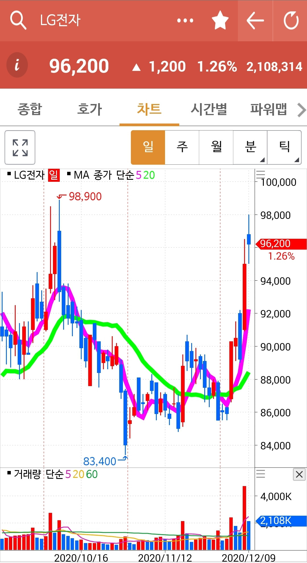 LG전자. 98,900원 전 고점은 반드시 넘을 것만 같은데 그러나 내일이 만기이므로 내게 시간이 많지 않다. 그래서 오늘 뛰어내렸다. 나의 원칙에 아무 매도신호가 나오지 않았음에도 불구하고 말이다. 내일이 만기니까 그냥 내버려 둘 수가 없었다. 어쩜 동생들의 말이 귀를 또 간지럽혔고 "언니! 일단 이익은 챙기고 보세요~" 나도 행여 수익이 날아갈까 불안한 감도 있었으리라. 어쨌든 나의 핑계는 만기일이 바로 내일이라는 것. 그러므로 하루를 두고 승부를 걸 수는 없다는 것. 일단 들어온 이익을 챙기고 보자. 그렇게 합리화를 시켰다.